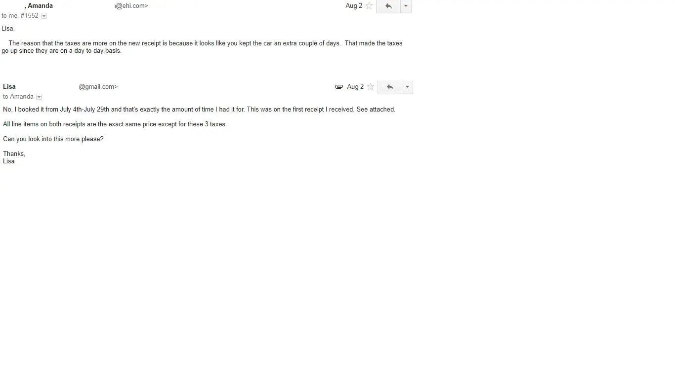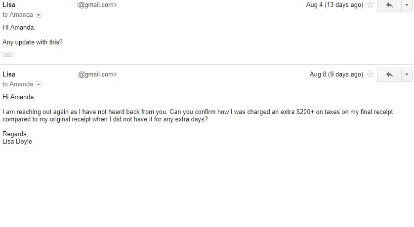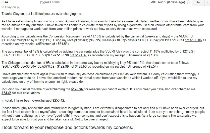I rented a car from Chicago from July 4th to July 29th 2017 from Chicago O Hare Enterprise. I got an initial receipt the first day of rental. When I returned the car on the 29th I agreed they can email me on my final receipt, because I trusted they would do it and do it correctly. I waited a week before I had to email them requesting a receipt. One girl, Amanda, replied with my receipt and I noticed it was approx $178 more than my original, I asked her why, as there was no obvious reasons. She could not explain why and told me it looked like it was because I "kept the car a few days longer than I should" which I did not because both receipts clearly said the same dates 7/4-7/29. I then started to look at the line items and noticed my taxes had increased, which did not make sense. I asked her to explain HOW the taxes were calculated to which she has never responded even after emailing her a few times about any updates. In the mean time another guy, Clayton, had emailed me my receipt (clearly no communication among them either) . He sent me the exact same receipt to which I also asked him why the prices were different, he admitted he could not explain the difference so he refunded me the difference (well he refunded me $185 which was a small bit extra and I don't know why). I was still skeptical about why my taxes were increased, so I asked Clayton to explain HOW they were calculated. He also stopped responding. So, as a person who actually enjoys mathematics, I took it upon myself to work out how the taxes were calculated by working off different and random rental prices off their website for a number of cars for a number of different dates. I worked out the equation and calculated my own taxes, this showed they had still over charged me by an extra $75 on taxes alone (add on the $178 for reasons unknown, I was overcharged a total of $253). I emailed all this to Clayton, asking him to review it and refund me what's rightfully mine. I have since not heard back from him, even after emailing asking for an update. So my next step was to just send in a complaint form to a generic Enterprise email. A guy, Kevin, did respond to me and was understanding and helpful. I did not go into as much detail with him about my calculations but did explain about being over charged. He did not ask much. He noticed I was already refunded $185, so he offered me a courtesy $50 for my troubles. This would have been great, yet I would have still been out of pocket by $18! Enterprise still owed me $68 for miscalculations on the taxes(as they gave refunded me $185 instead of $178, $68 this was they remaining difference), so giving me $50 "for my troubles" still did not even cover what I was overcharged. So I replied saying yes I would gladly accept his offer of $50 but I would actually like to be refunded my $68 also that was rightfully my money! He replied with "I refunded your $68 but now I cannot give you the courtesy $50" . Great, I finally got my money back that was rightfully mine, but I don't understand that one minute he can offer me compensation for my troubles but then when he refunded what was rightfully mine he can no longer give me compensation for all the trouble I just went through? Disaster of a company. I'm sure so many people are over charged and don't realize it. As a customer, we expect our charges and taxes to be calculated correctly and honestly. No one usually checks their receipts line by line, but they should start! I will gladly help anyone *for free* by looking at their receipts and calculating their taxes correctly if they feel they were not right! I finally got my refund after 3 weeks of emails to 3 different people, but to be offered compensation and then to be told they can no longer give it to me was a slap in the face. I was awarded ZERO compensation for all the trouble I just went through to get $253 back that I was overcharged with. Treat your customers right, Enterprise. You just lost 2 customers and I will definitely tell my story to as many people as possible.