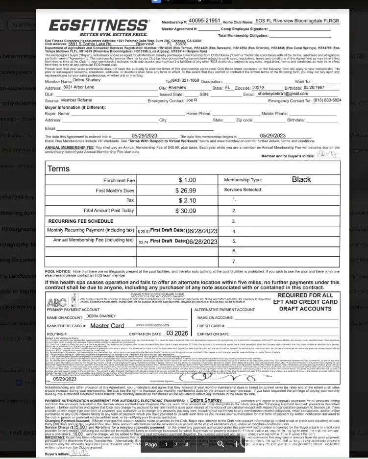 Hello, my name is Debra Sharkey of Riverview, Fl. I signed up for the EOS Gym in Riverview, Fl. When I signed up with James on 29 May 2023. I really felt as if this was a great relationship the way this was explained based on my needs. I was a long-distance endurance athlete, suffered injuries that had me sidelined for a few years and was ready to get back into the gym. EOS offers on their website post-injury rehab and anti-aging prehab, just what I needed pending another surgery on 28 Aug which was clearly stated and is noted in my PII file. Signed on the dotted line, charged on my credit card 6/12/23 $280x4 60 min sessions. What I got was bounced around to 4 different trainers. Then I had to travel for 1 week for work in June. Upon return, Andrew Reyes contacted me and stated he would be my trainer. We met on 28 June 23 and went over desired outcomes and restrictions. I explained we were not where I wanted to be because of not having gym training in June and that we would only have 8 workouts in July because I had to travel for work for 2 weeks in August, but would like an on-the-road plan.