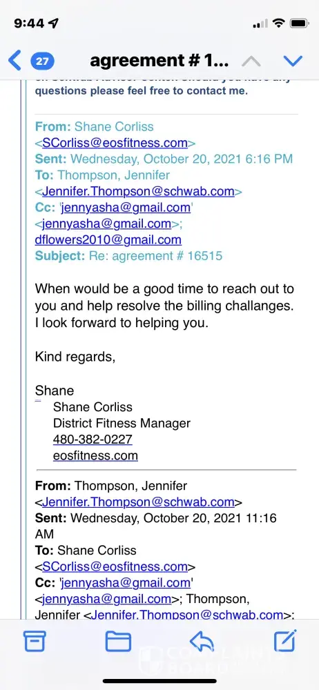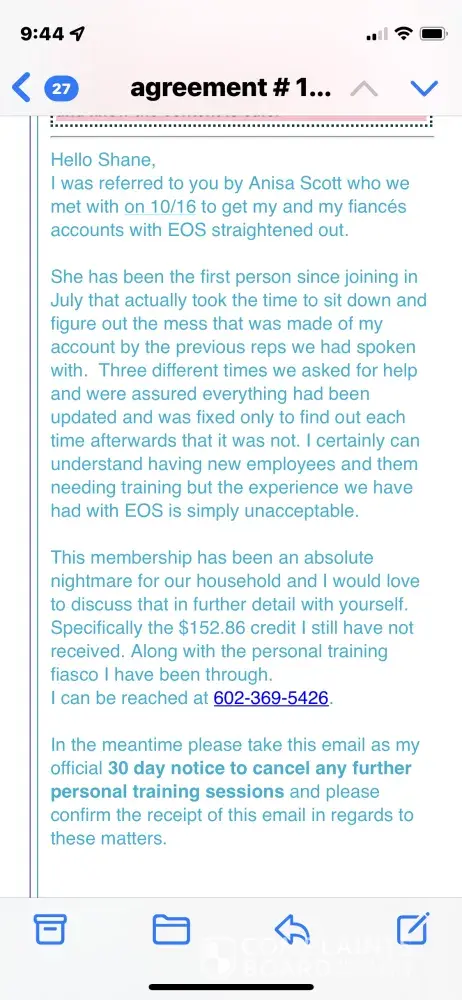 EOS refuses to give any paperwork to confirm that they have cancelled your account, or cancelled your training sessions. Instead, the Operations Manager and the General Manager will say they can't give you any paper confirmation but verbally promise and swear they did it. They did this to us twice, once after a year then they said it was done. And again after an entire SECOnd year went by, then they again suddenly start automatically pulling tons of money out of our bank account and say they have no record of a cancellation.