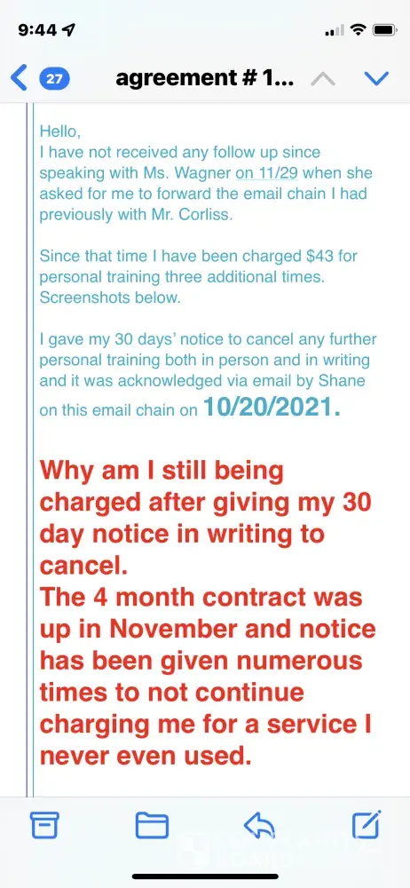 I've given both in person in October to Anisa Scott and via email on 10/20 notice to Shane Corliss my intent to cancel the personal training. He acknowledged having received my email prior to his untimely passing. The contract was up in November and I am still being charged.