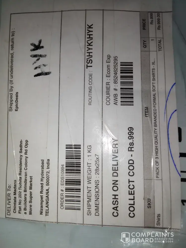 I have ordered 3 shirts from epic deals on 22 Jun 2019. My order ID was EDS10994. It was delivered on 03 jul 2019. The shirts quality was very poor and not at all fit for use. It seems pieces of cloth was mixed and stitched. For the last 5 days I am continuously sending mails to support@epicdeals.com. there was no reply from them. Please arrange my refund of money and pick the items back. The aount was also huge as Rs. 999.