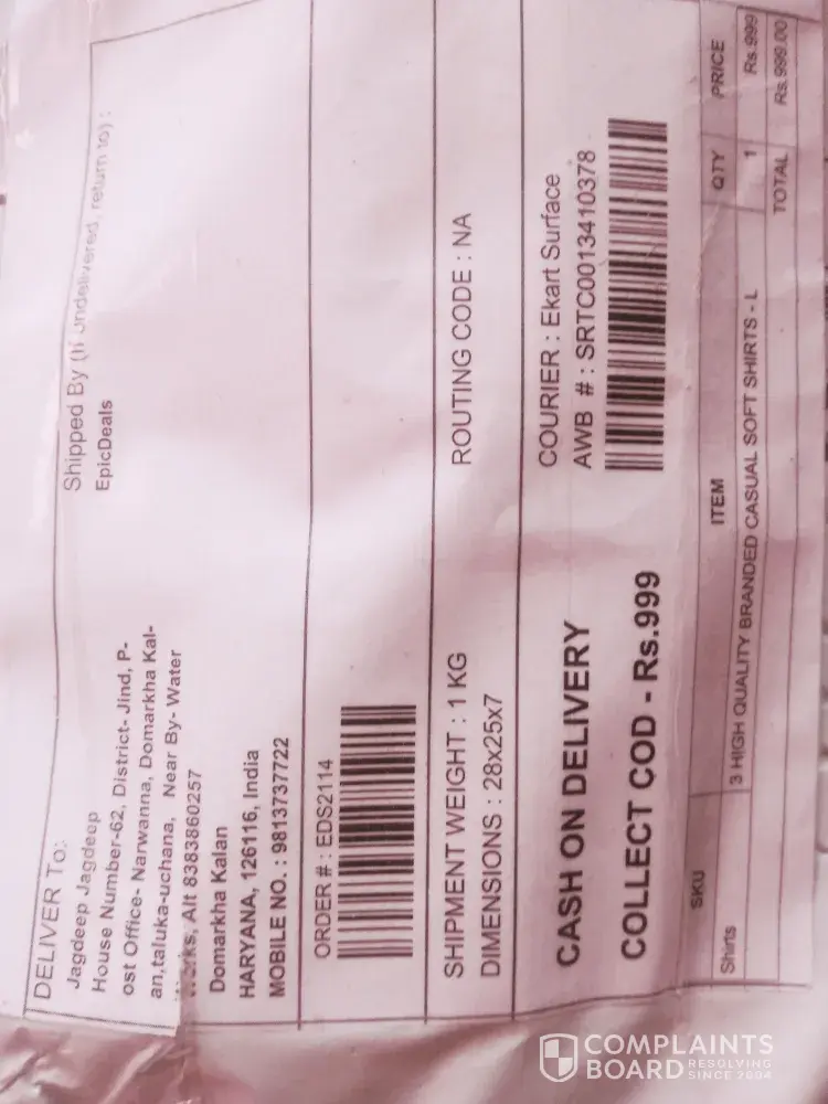 We have ordered shirts 42 size and it has come wrong 38 size Wrong pattern and wrong size.38 Combo of 3 shirts... It is the worst shopping site..please every one Dont buy anything from this site. Every thing is worst... All products are worst. Our rupees has wastes.1000 rs. Epic deal is very bad online shop. i m going to consumer court against epicdeal.in .pict attached and i hav ordered place pic also attached.