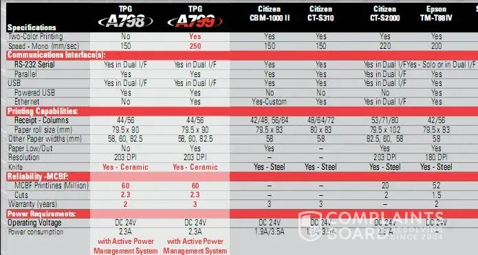 CognitiveTPG also manufactures direct thermal receipt printers which compare favorably with Epson. Their A799 thermal receipt printer is their premiere printer and is actually faster and more durable. Let's take a look at the data sheets for both manufacturers' printers.
