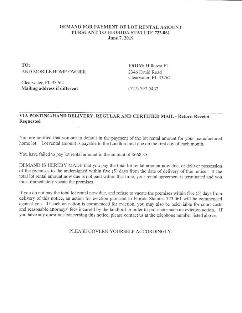 The management here is rude! My 70 year old mother has owned a home here about 4/5 years. She has never been late on a lot payment and this is the registered letter she received; only after 7 days. Her rent is set up on bill pay through her bank. The money was withdrawn from her account. Unbeknownst to us, her payment was not applied. It appears that the payment was lost in the mail, or by the office. I am a reasonable person, but this letter is inexcusable. It really upset my mother and for good reason. Who treats people decent like this? I called the office, which is right across the street from her to ask if this was a form letter required by corporate or generated in house. A simple question, only to be hung up on by sylvia. Understandably, this set me off. I simply wanted to address why they would send such a forceful letter to someone who has never been late? A decent and great tenant. They couldn't make a simple call? Send an email? Walk across the street? Don't believe these reviews, mostly by "local guides" this place is steadily going down hill. Rumor has it the office staff is deplorable and the park is poorly managed. As a business person, I understand having to protect one's interest and sometime one has to be forceful, but sometimes mistakes, such as this happen. This current management is running out "decent" homeowners left and right. Maybe the hillcrest staff is immune to getting these threatening letters; we are not. Due to legal requirements, etc. And to protect themselves I understand if a forceful letter is sent, as a second letter. And when I called to ask about it; I was laughed at and hung up on. Again totally inexcusable. So, if you are a responsible person and you choose to live here - I hope your payment does not get lost in the mail. Please know that I immediately called the bank, cancelled the lost check, had the bank call the office, and paid (w/$50) late fee - all that same day. I would have done this without the threats.in fact, had they been decent this would have been resolved days before. My mother's place is well taken care of, she is quiet and keeps to herself. Yet she was treated with no respect. Shame on you hillcrest!