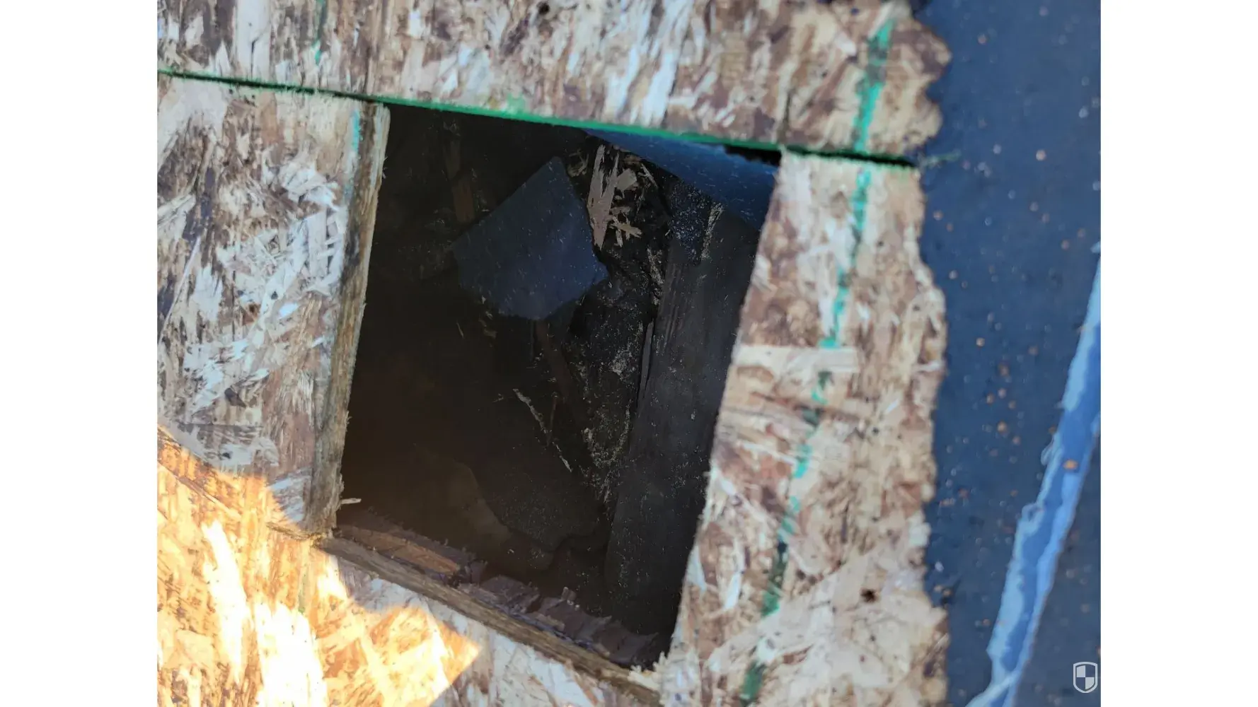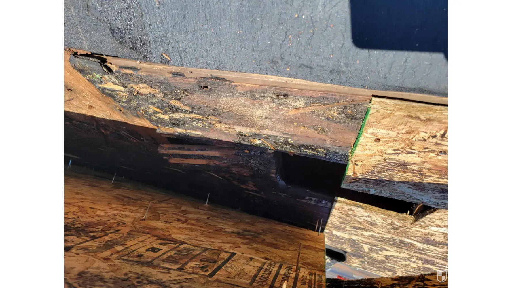 February XX XXXX we had a large piece of the roof soffit break off and open a hole in the side of the roof.