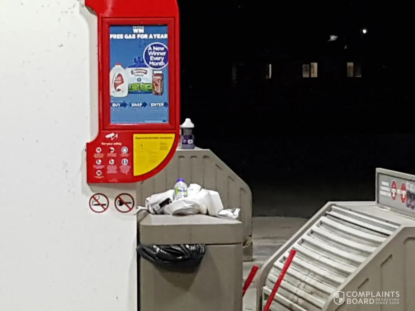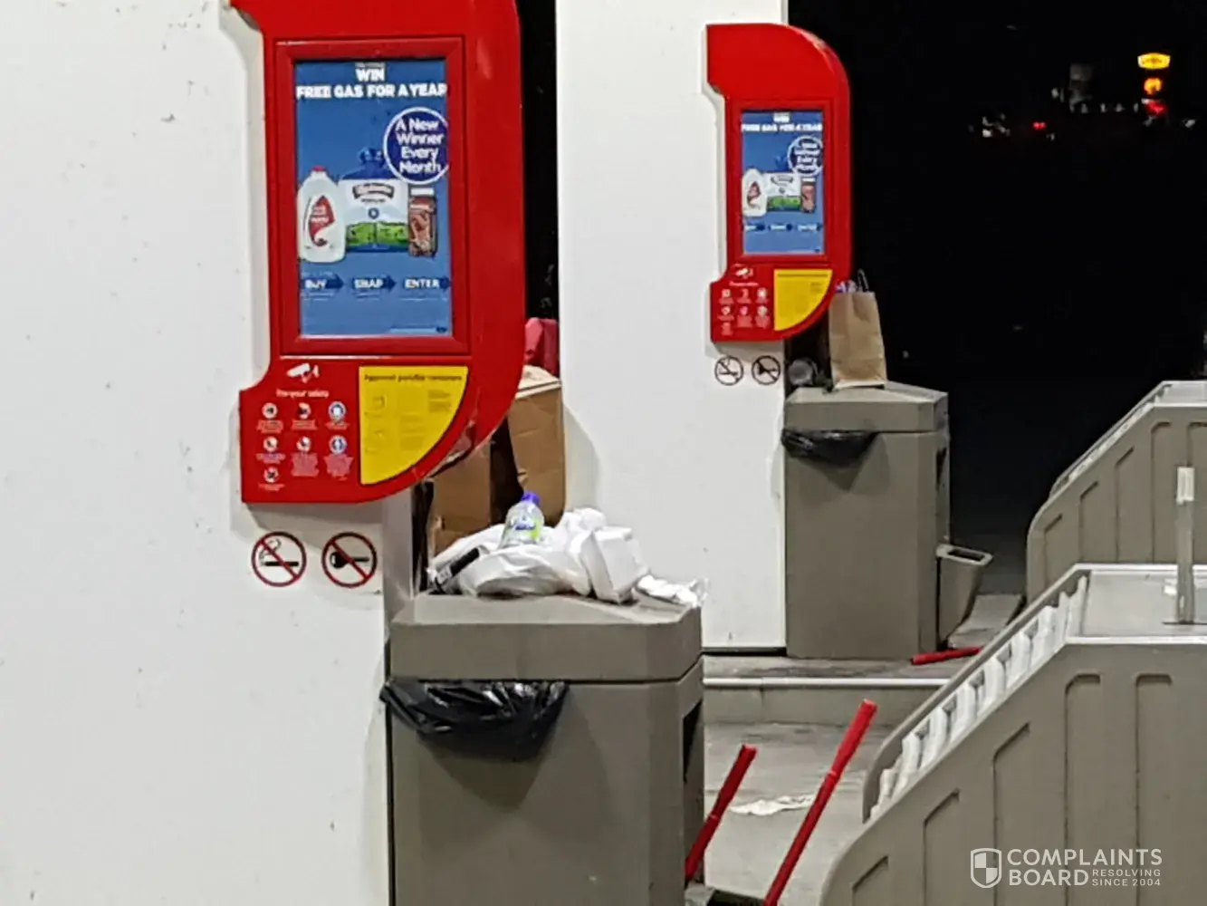 12 July 2018 around 22h00 I stopped to tank up my pick-up truck at the Esso station located off exit 814 on Hwy 401, South Lancaster, Ontario. I could not believe the filth the greeted me as I pulled up to the pumps. It was like I had entered a gas staion in a third-world country. Totally pathetic, garbage cans were overflowing and gsrbage was piled up on the ground. The pump was covered in some sort of sticky goo that had also accumulated on the ground in front of the pump. The buckets for the windshield washer squeegies were polluted with paper towel, garbage and the the fluid was just dirty ditch water not washer fluid or a soap and water mix. I was empty so gased up regardless of the chaotic neglect. I went inside store and mentionned my dissatisfaction with the clerk but she just acknowledged the situation and blamed the lack of a sufficient number of employees to provide a better upkeep! [censored]! I told her I was there several times in the past and it has always been dirty but that this was the worst I had ever seen. She suggested I take photos and complain to Esso Canada. Consider it done! Photos attached.
