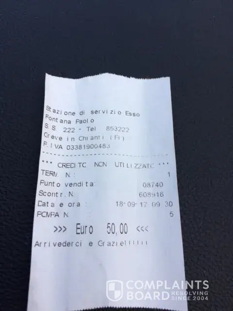 Please help. I placed 50 Euro note into payment machine to get diesel fuel at Esso Greve in Chianti Italy. The machine takes your money but doesn't give the fuel only a fuel credit receipt. A local informed me it is a tourist trap scam that the owner and Esso had set up, that they know about it and avoid it. I left my contact details [protected]) for the manager to contact me but this has not happened. There was also 8 other complaint notes in the box as well from other ripped off customers. I have emailed Esso customer service and still nothing. I will follow this up to the highest level to receive my refund or a fuel credit I can use in Australia. Unhappy . Alan Kiernan