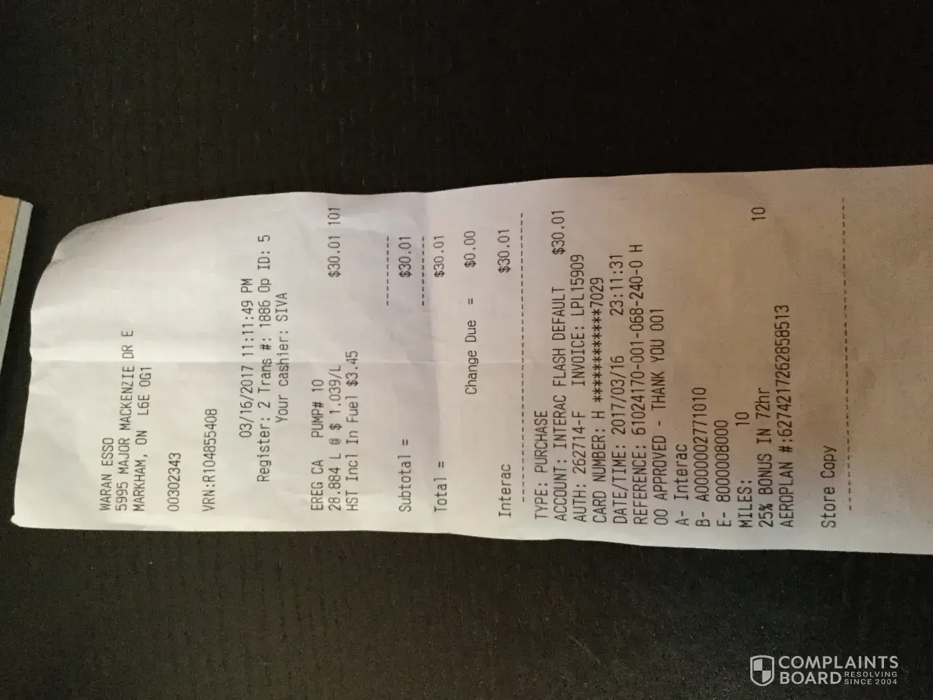 The receipt also contains my aeroplan number to show how much business I bring to Esso and receipts can be provided if necessary.