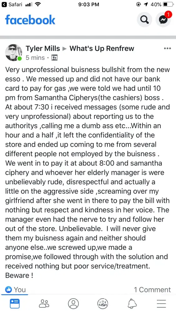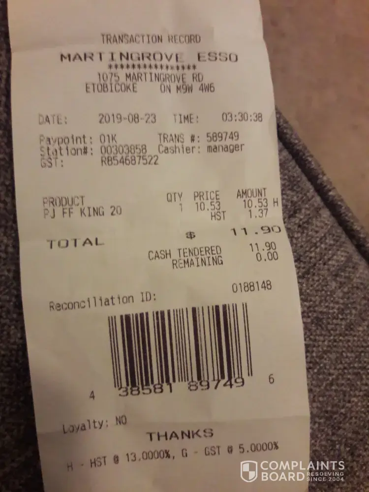 I went into Esso station in Colborne I filled my tank with gas and went in to pay and cash in4 winning lottery tickets. While waiting on me a man walked in. He pushed my stuff aside and said to man can I help you. He was very friendly to man but to me he barely spoke. I had to wait til all the men In the store had been waited on then he finished my transaction. I couldn't leave as I hadn't paid for gas yet. He definitely treated me with disrespect because I was a woman. I have never been treated like this. How you handle this depends on weather I contact the Toronto Star or not.