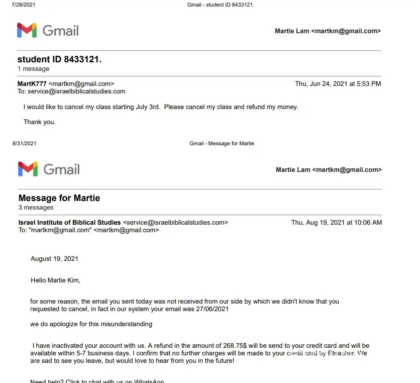 Desired outcome: to be able to reschedule the courses I have paid and registered for.Better an immediate cancellation with no more costs to pay, so I can enrol on a real Biblical Hebew course, worthy of payement.