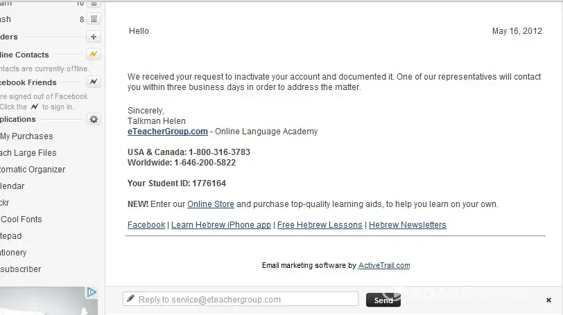 Today, the school went ahead and deactivate my Greek A Course I am taking up 28 Unit class already. Upon contacting their customer service, They claimed that I requested my account to be deactivated whichI never did. I am now stuck and frustrated without getting access to my paid class. This eTeacher Group needs to be called to order for the false act of advertisement they are offering to people. They give false claimes to things that are not true. They are desperate to make money even by fraudulent means.