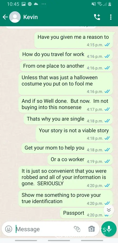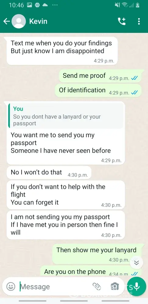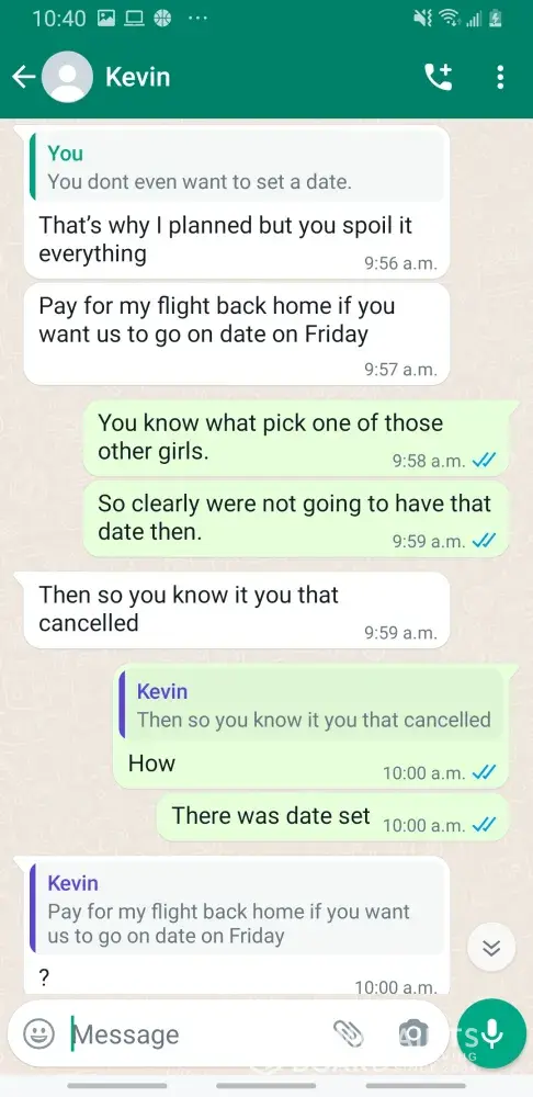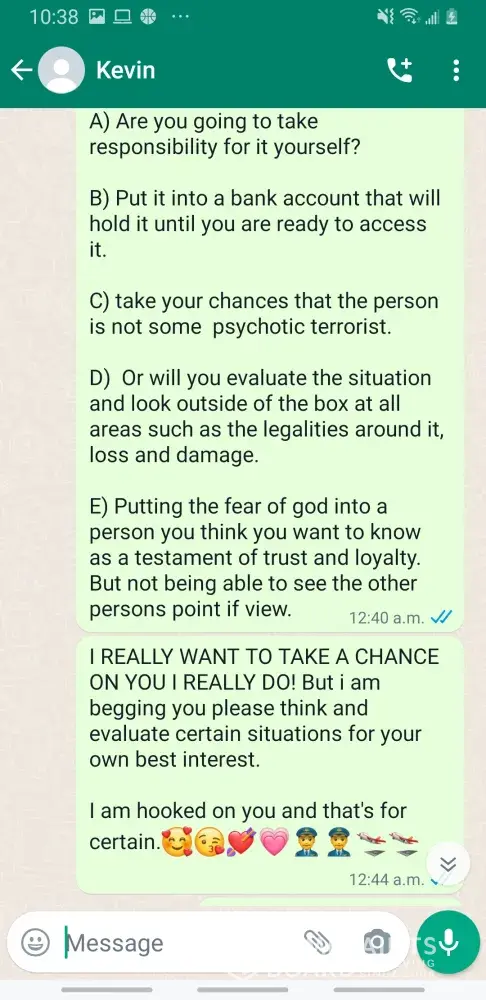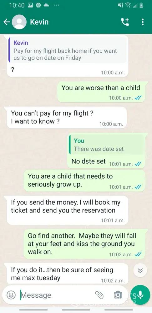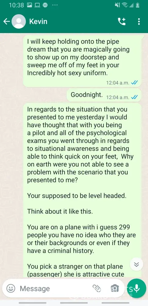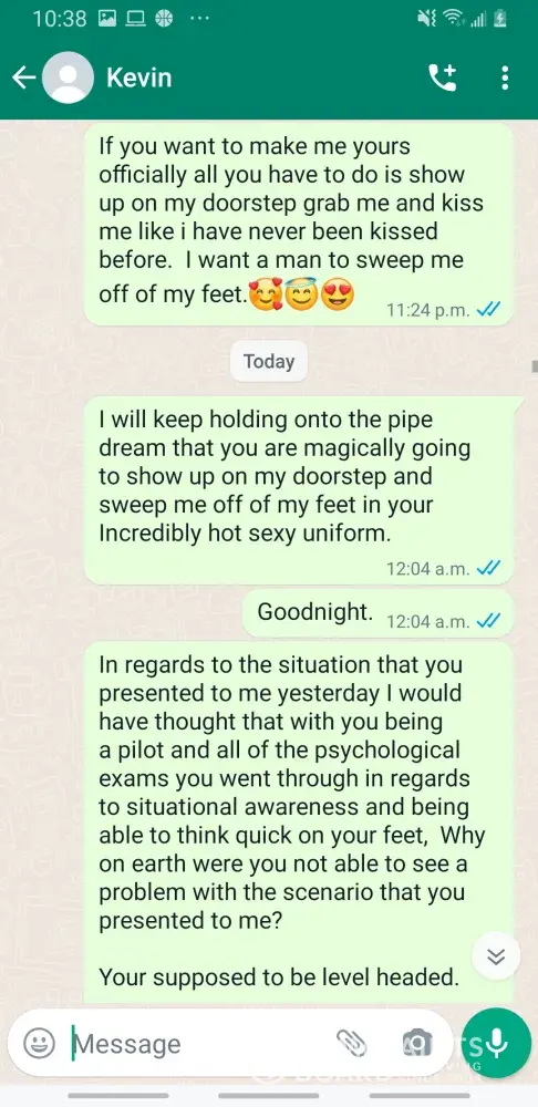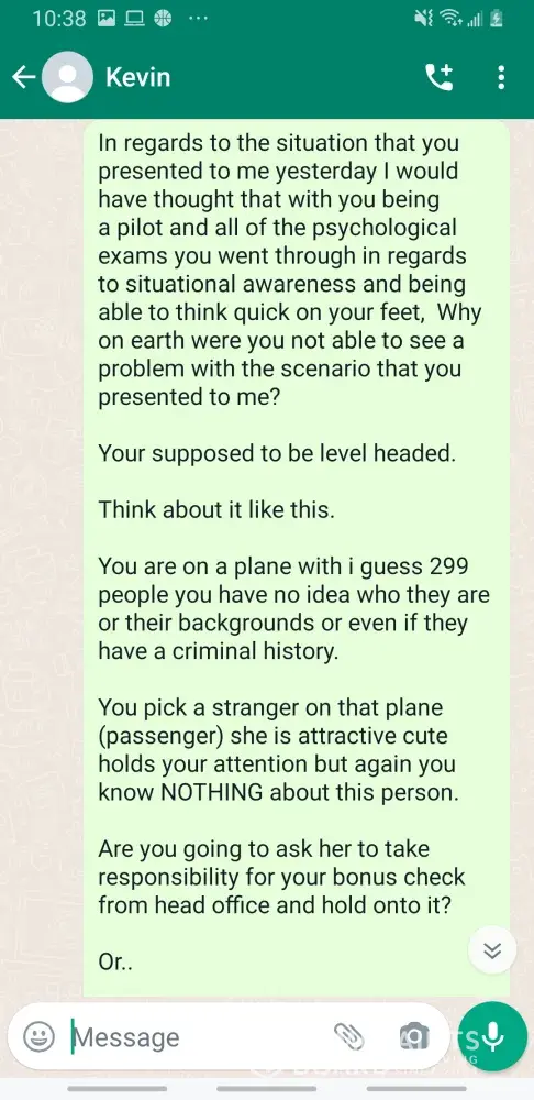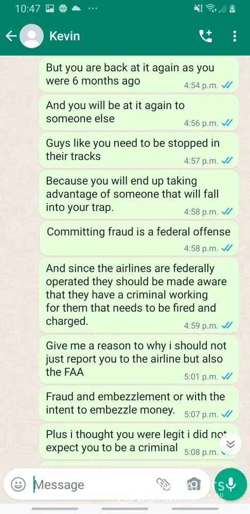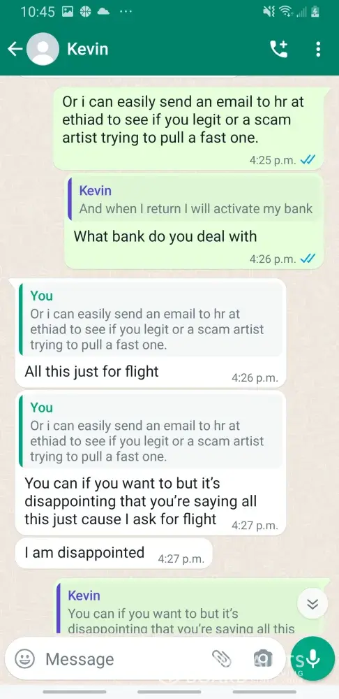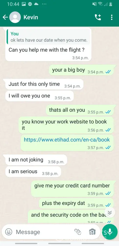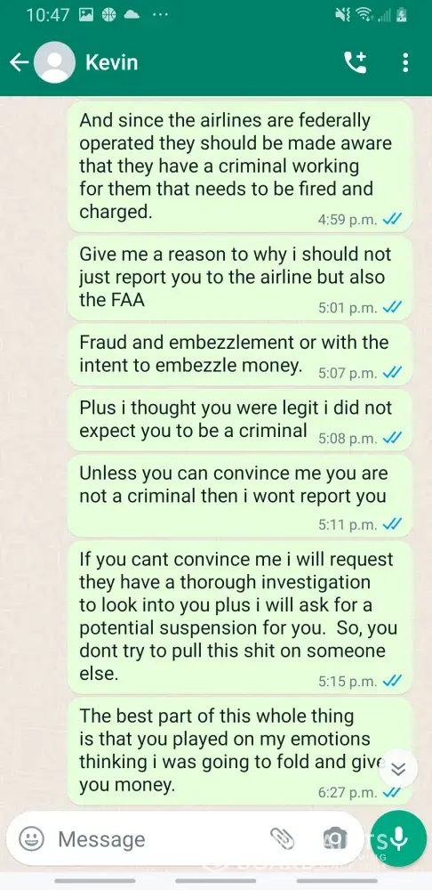 Kevin Becker started talking to me on Facebook dating apps in June of 2020 he started off as seeming like a nice kind person but as time went on he was using the fact that he is an Ethiad Airways pilot and guys like him are the best out there. The bribes started that he needed me to pay for his ticket to Fly out and making up stories that he was robbed to pull at my heartstrings. He was using his uniform and his position of power and bribing me while he was supposed to be preparing for a flight. I think this pilot is doing a real injustice to the airline and misrepresenting the airline and the airlines' morals and values. I will attach further documentation of the situation this has happened three times with him trying to bribe me. This would also fall under as fraud. He flies flights from Abu Dhabi to Frankfurt and other parts of Europe. He is in the UAE part of Ethiad. Make and example of him to make sure this does not happen to anyone else.