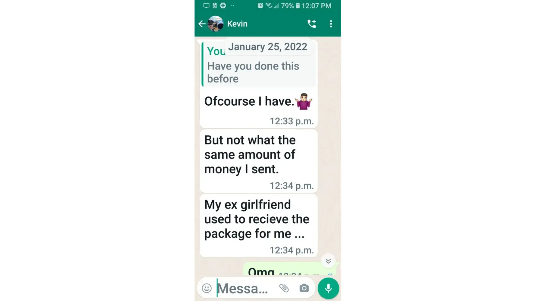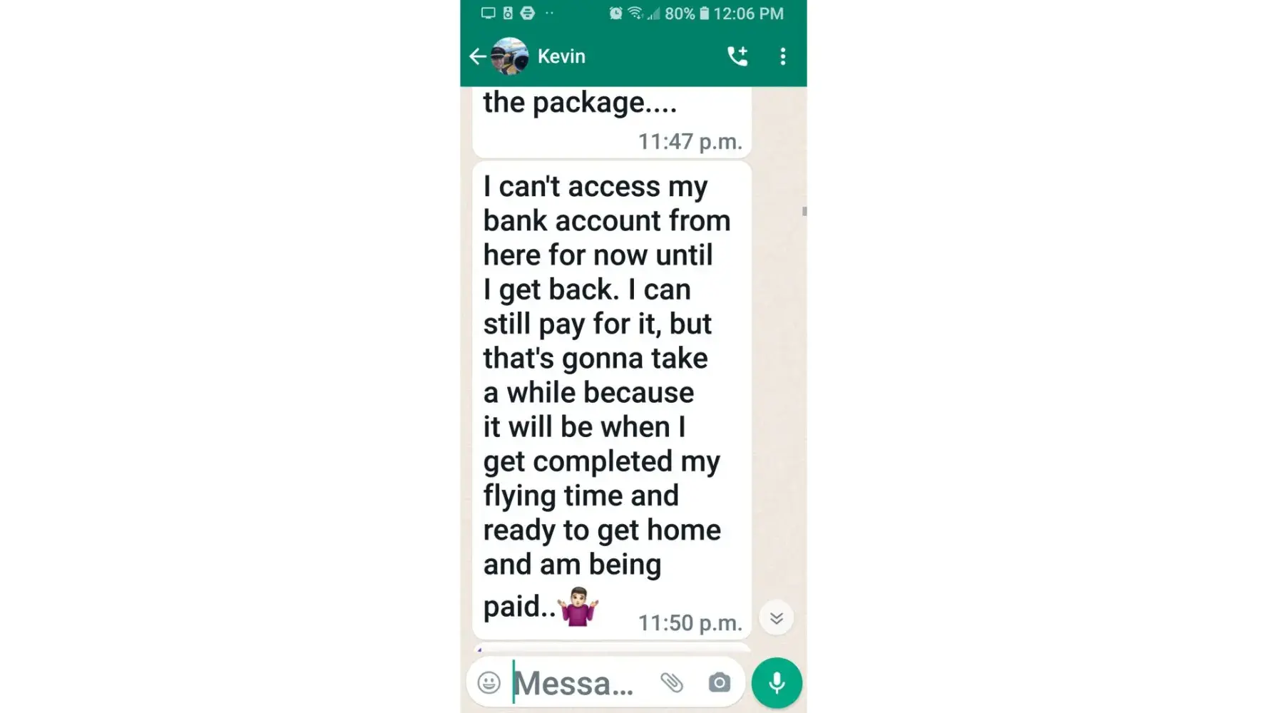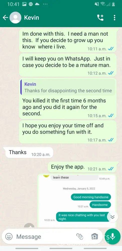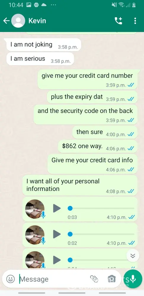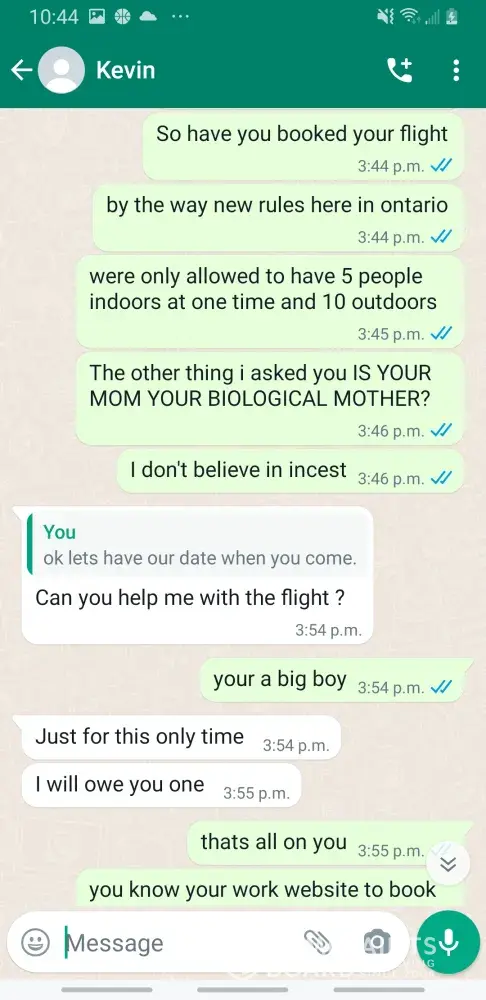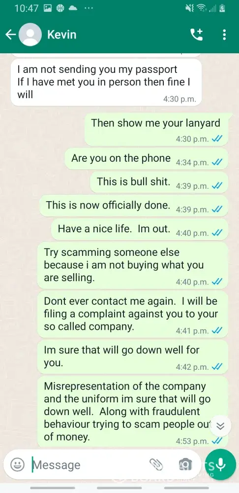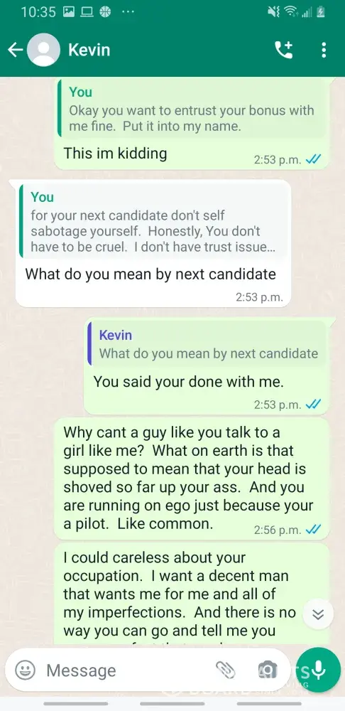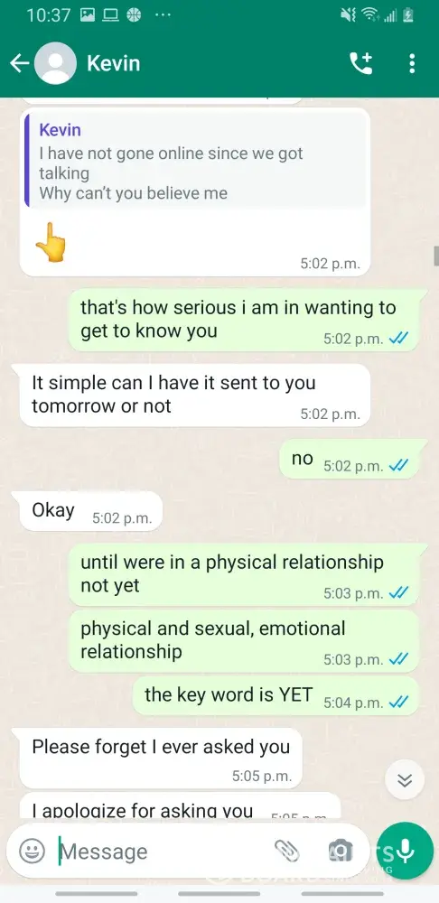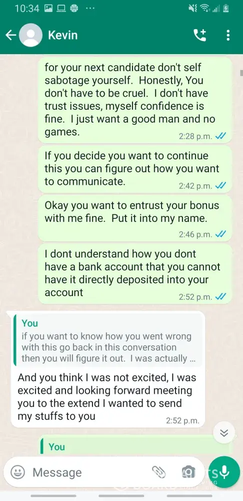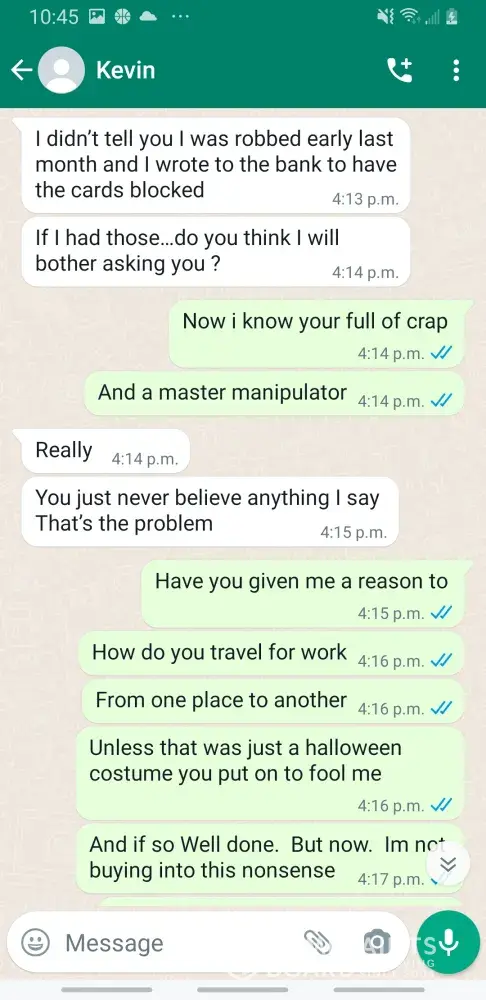 Kevin Becker started talking to me on Facebook dating apps in June of 2020 he started off as seeming like a nice kind person but as time went on he was using the fact that he is an Ethiad Airways pilot and guys like him are the best out there. The bribes started that he needed me to pay for his ticket to Fly out and making up stories that he was robbed to pull at my heartstrings. He was using his uniform and his position of power and bribing me while he was supposed to be preparing for a flight. I think this pilot is doing a real injustice to the airline and misrepresenting the airline and the airlines' morals and values. I will attach further documentation of the situation this has happened three times with him trying to bribe me. This would also fall under as fraud. He flies flights from Abu Dhabi to Frankfurt and other parts of Europe. He is in the UAE part of Ethiad. Make and example of him to make sure this does not happen to anyone else.
