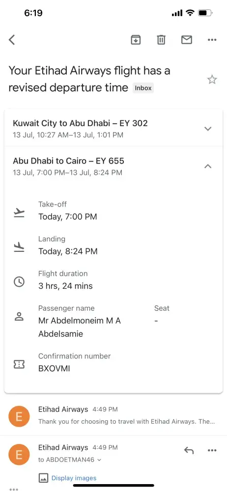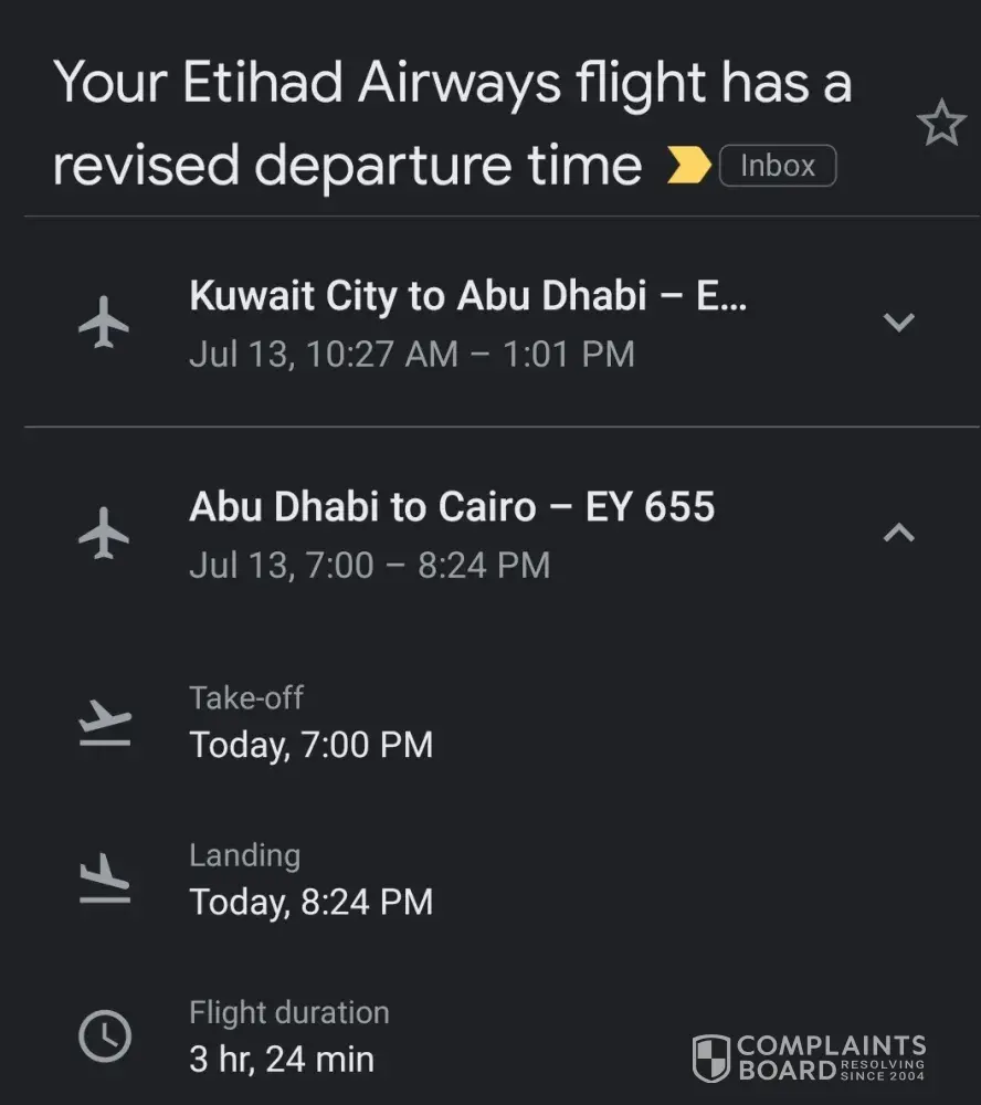 My flight from Abu Dhabi airport took off at 2:25 minutes. It was delayed due to various reasons that are not correct. Then the official said you go without your luggage and it will catch up with you. Then, after many discussions, the flight was postponed until 7:00 pm, and this will not satisfy me and will not satisfy you as we transit from Kuwait From 10:05 from Kuwait Airport