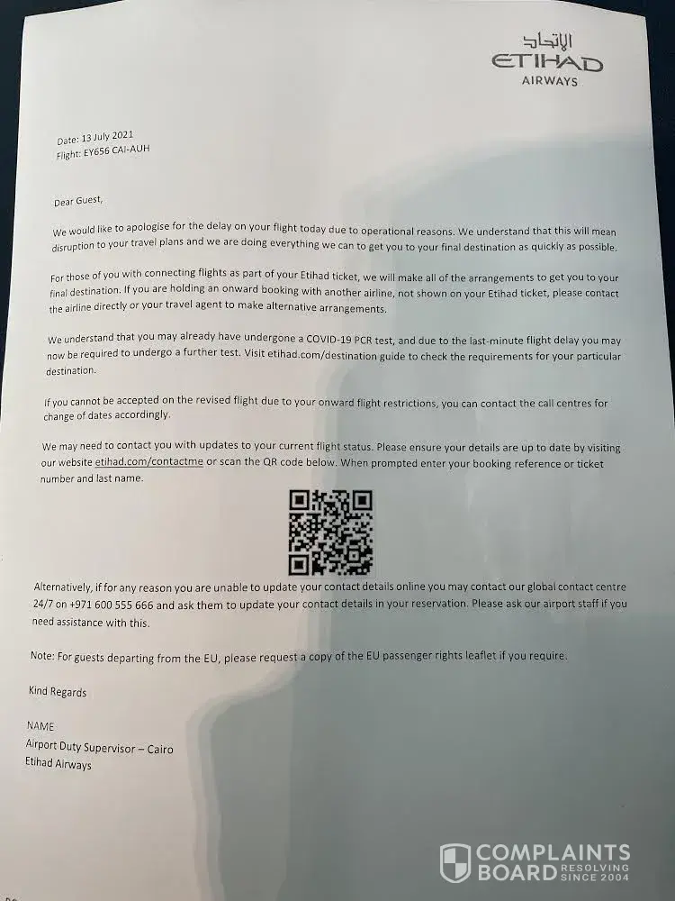 Your company cancelled the flight from Cairo to Maldives, flight No: EY656 on 13 july, 2021 ( 17:35 ) as shown in attached apology letter.