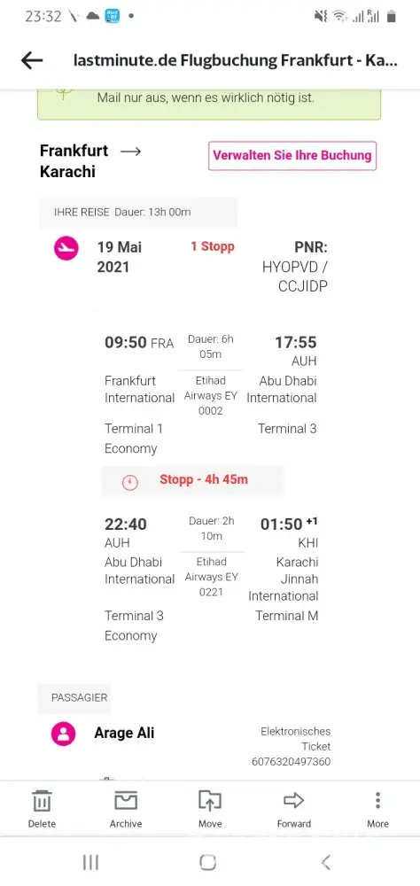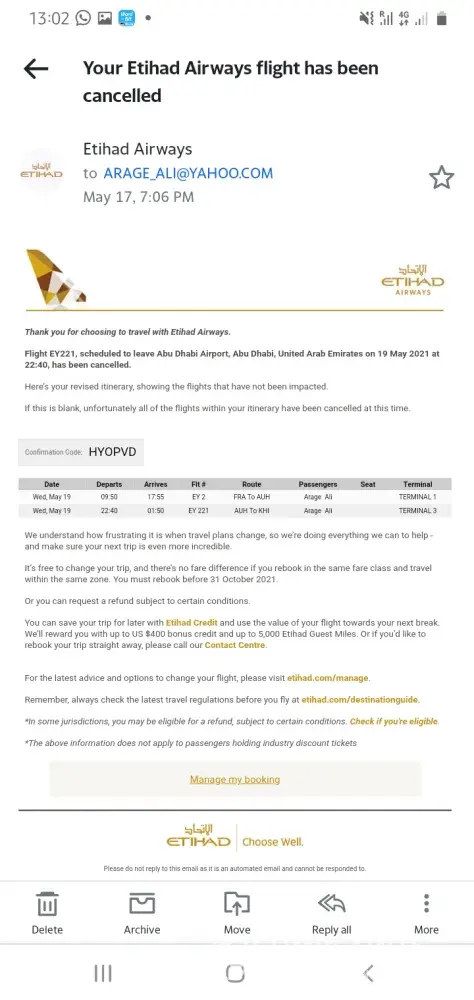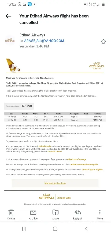 My name is Arage Ali with date of birth 04.01.1984. I booked a ticket for Etihad Airways from Frankfurt, Germany to Karachi, Pakistan with online agent called Lastminute.com (Bravo Fly) with booking ID:[protected] on 13.05.2021. The flight was scheduled for 19.05.2021 but unfortunately flight EY221 was cancelled by Etihad Airways and I am enclosing the snapshot of cancelled flight.
