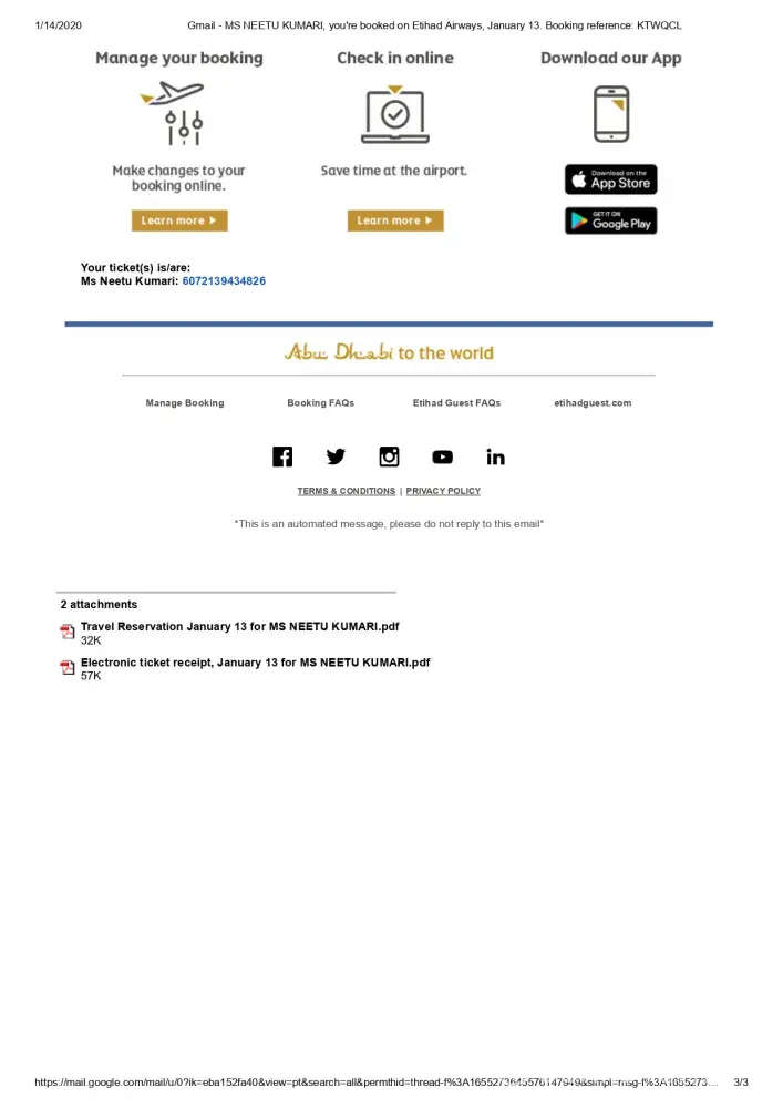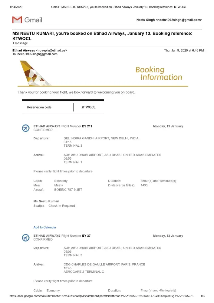 Hi my name is Neetu Kumari I I had booked the flights from new Delhi to Lyon by Abu Dhabi and Paris from Paris to Lyon I got a train ticket given by the Etihad airways which was very new to me.