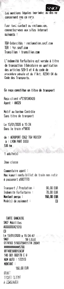 so after reaching to Paris by flight got delayed almost 15min and than after the immigration and everything I reached the baggage collecting point and there it took almost 20 min for my bag to come and I had only 10 mins to catch the train but as there was no seat no. was indicated in the train ticket given by Etihad I asked a security personnel he told me to directly go to the train and show them the ticket so I did the same and than the ticket collector charged me 160 euros saying that it will get refunded by the airline so I even asked at the Lyon train station and they told me to write directly to you so my concern is about my refund; here I have attached the bill with all the necessary details.