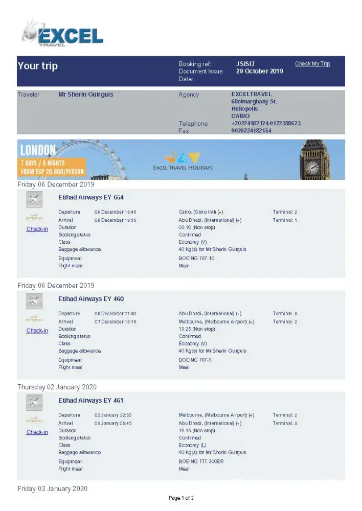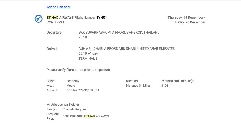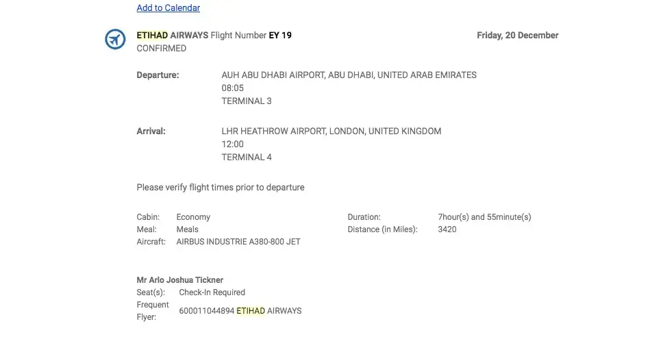 Flight details: From Colombo to Abu Dhabi EY265 Seat 9B on 15 February 2020 From Abu Dhabi to Cairo EY651 Seat 8D on 16 February 2020