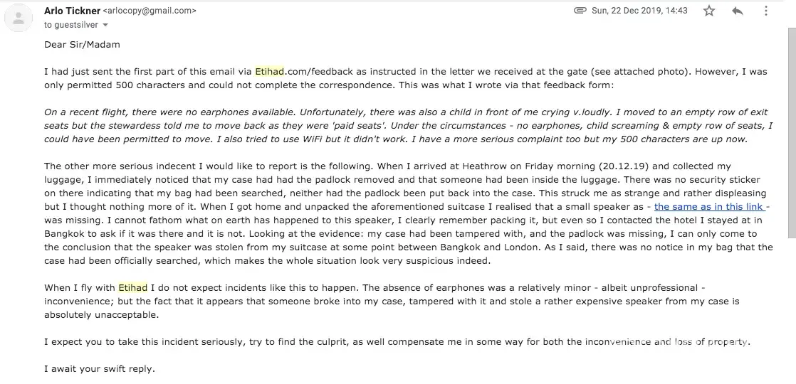 I took an Etihad flight from Bangkok to London Heathrow (via Abu Dhabi) on 19.12.19. When I arrived at Heathrow on the morning of 20.12.19 and collected my luggage, I immediately noticed that my case had had the padlock removed and that someone had been inside the luggage. There was no security sticker on there indicating that my bag had been searched, neither had the padlock been put back into the case. This struck me as strange and rather displeasing but I thought nothing more of it. When I got home and unpacked the aforementioned suitcase I realised that my small JBL speaker was missing. Evidently, someone broke into my case, tampered with it, and stole an expensive speaker.