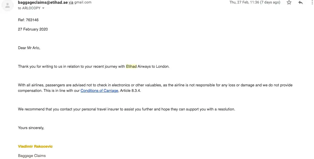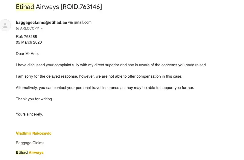 I contacted Etihad and have since spent two whole months trying to get a resolution on this matter; they made me jump through multiple hoops, chased them on email (they are dreadfully slow at replying ), I supplied all evidence requested, only for them to tell me that it is not their responsibility.