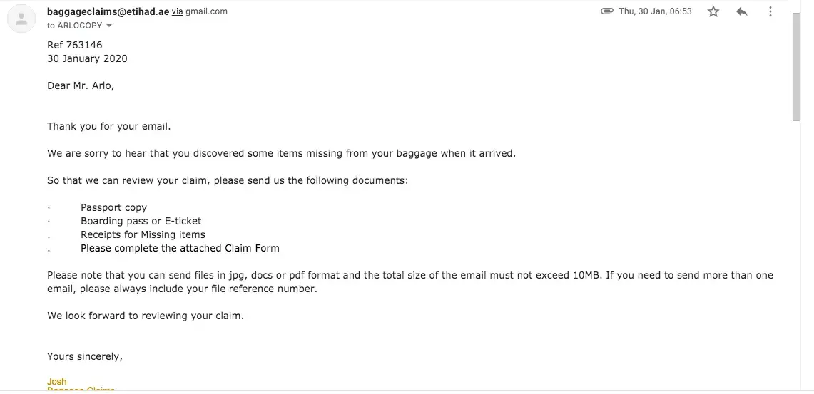 I await your prompt action and attached you will find airline ticket as well as airline letter with incident,