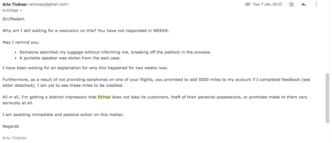 I have contacted Etihad Gold Customer Service over the last couple of months and this matter has not been resolved.