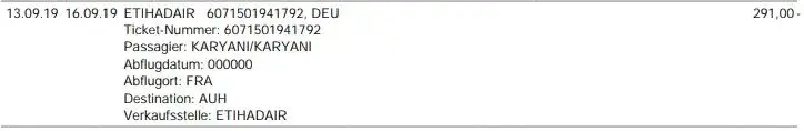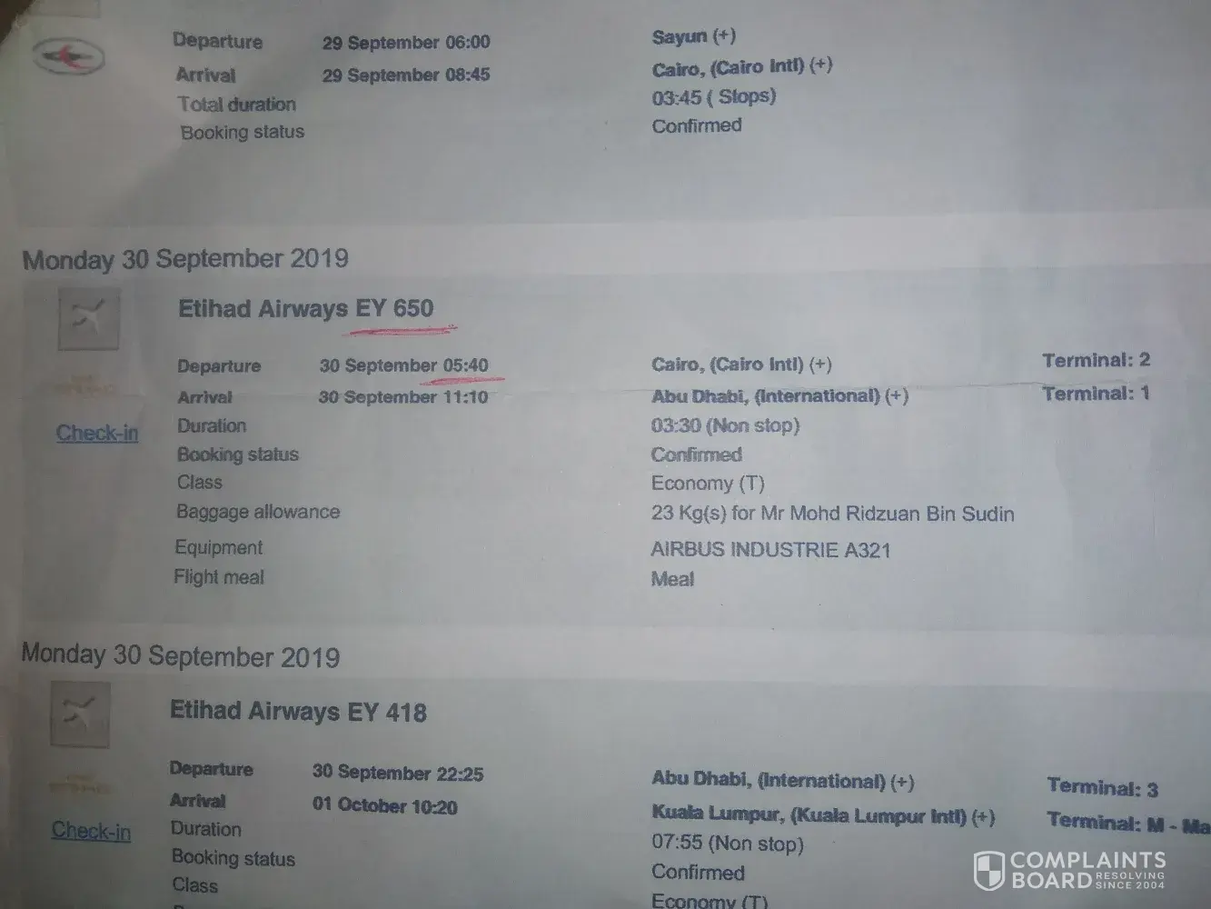 As printed from Amadeus, the flight detail shows the schedule on 30 september 2019 on 5.40 a.m. The flight number is EY650.