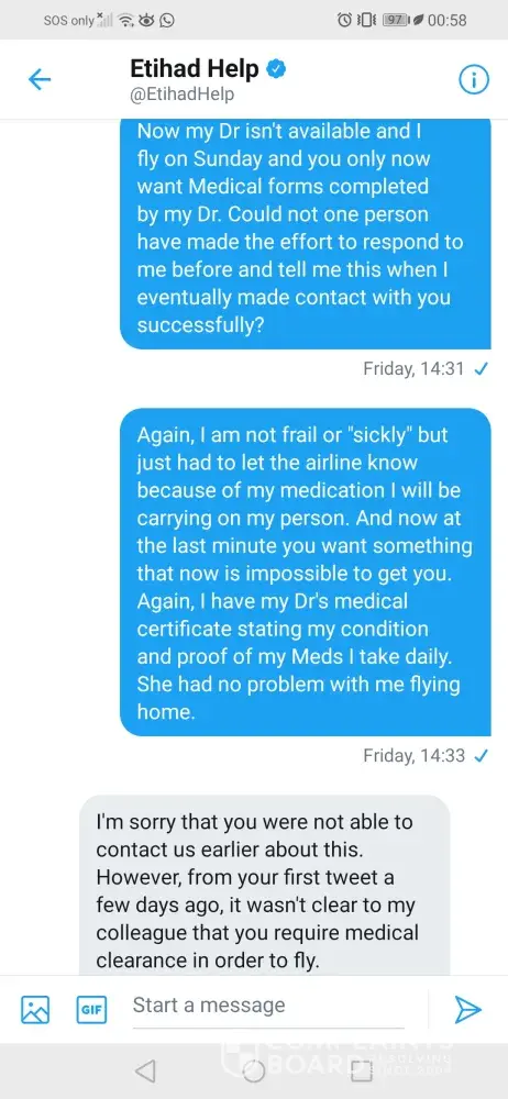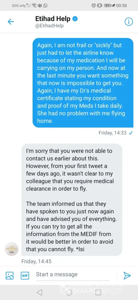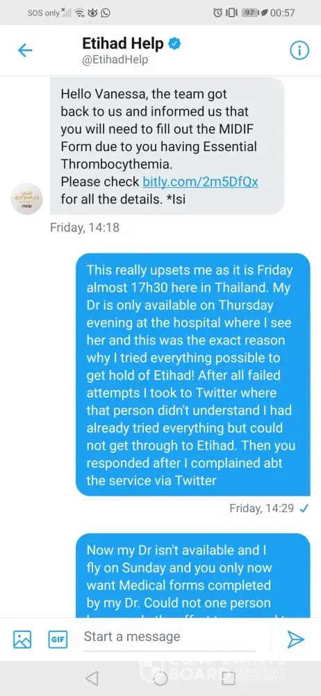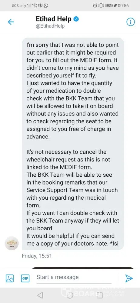 My name is Vanessa Rhoda, flight ref FAHLUL. I booked this flight to go home to SA to visit my ailing father & children. First, none of the customer care nrs in Thailand worked when I tried to arrange wheelchair assistance & authorisation to carry my chemo drugs. Etihad eventually responded when I took to Twitter. After long correspondence & asking what was required because my Dr is only available on Thursdays, they got back to me Friday evening saying they needed me to apply for medical clearance & my Dr has to complete their Med. Clearance forms. If not, they could deny me boarding on 29/09.After speaking to numerous people & explaining I was cleared by my Dr & am fit to fly, they still insisted I call the hospital & get a Dr to do the forms. All my explanations fell on deaf ears. I called the hospital but no Dr who wasn't my attending Physician wanted to do it. The airline's response:"you could be denied boarding"