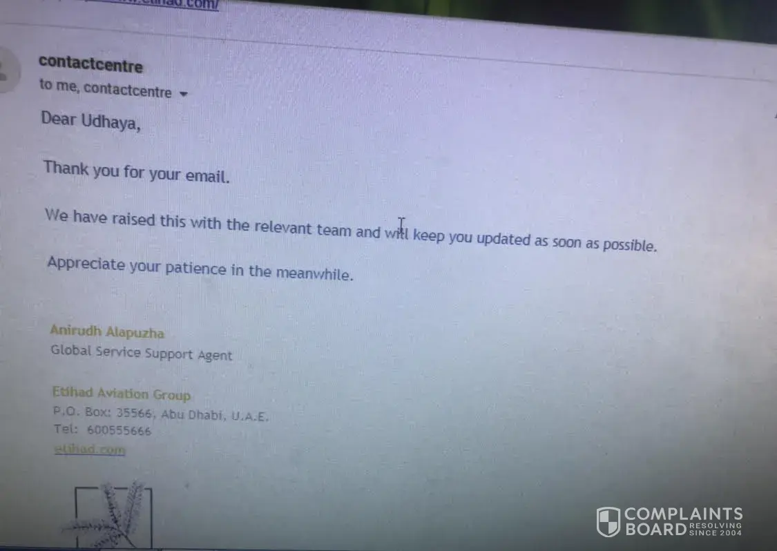 Well Etihad i have news for you because as he was at the airport while all this is going on i was speaking to Etihad via messenger to a woman named Rose so i ask your lying staff what is going on. Almost 12 solid hours we have spent sending e-mails trying to sort this out with no all very little response so now you must imagine how angry we are.