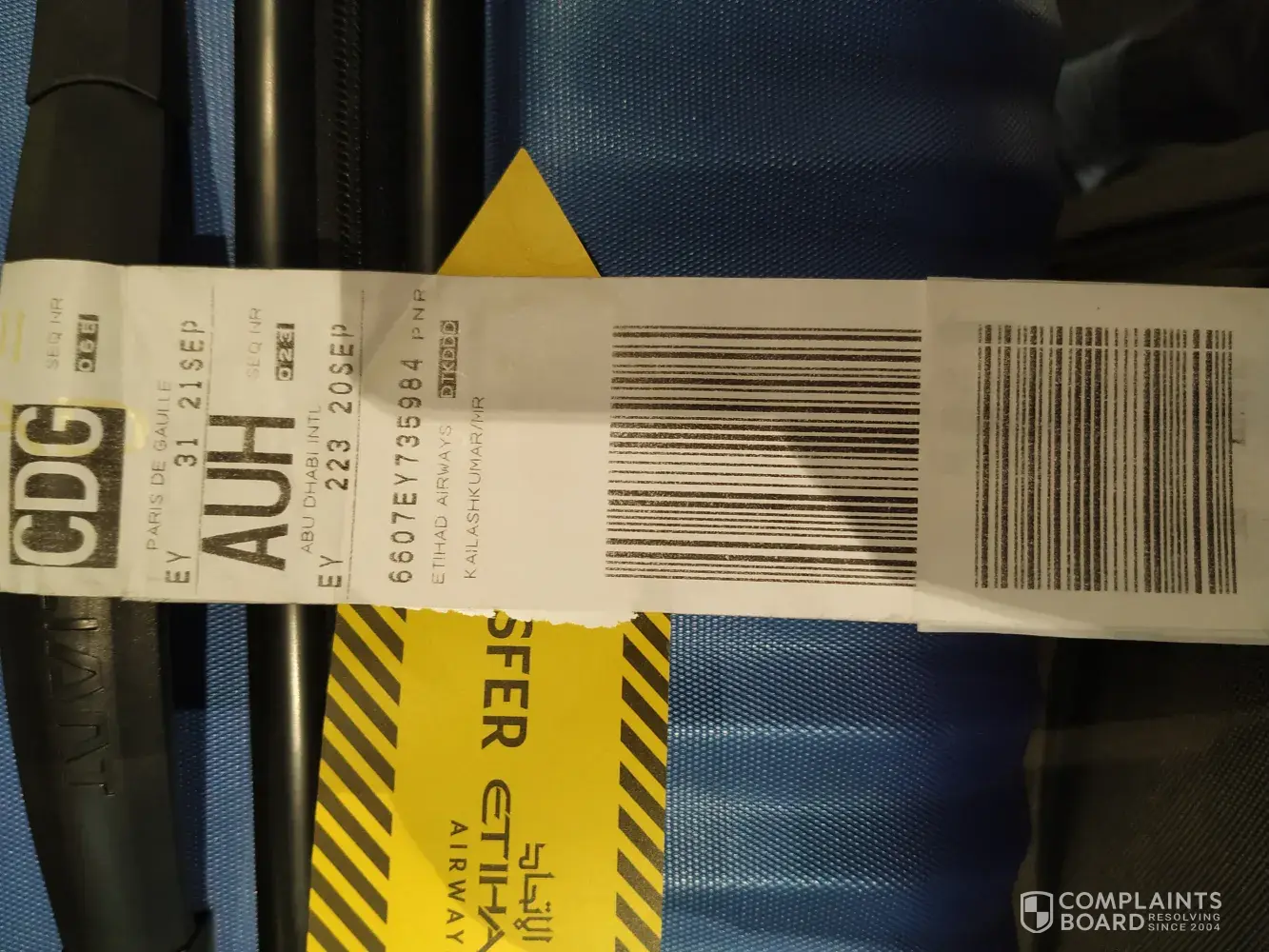 My new trolly suitcase's logo was missing while travelling from Paris to New Delhi via Abu dhabi on 10 September.