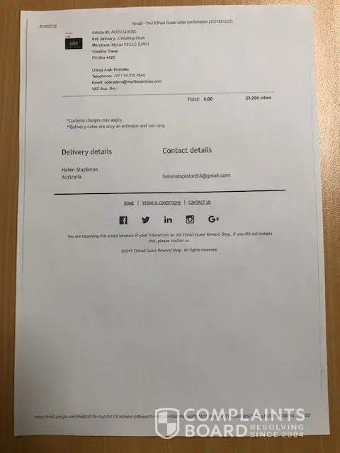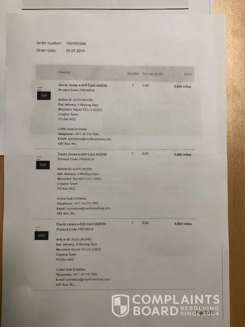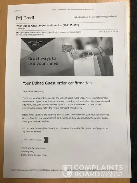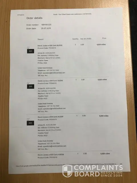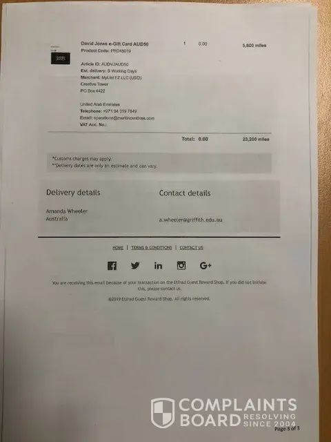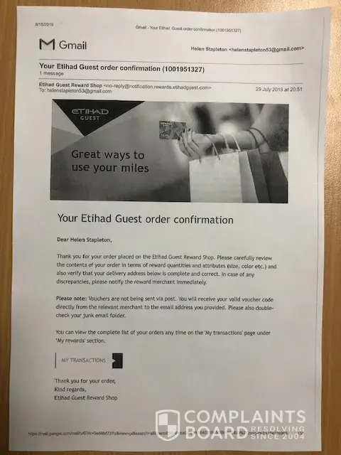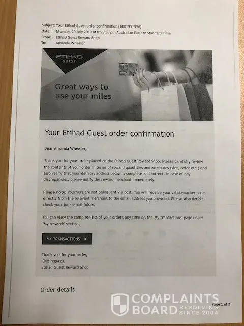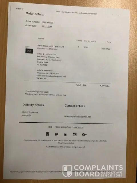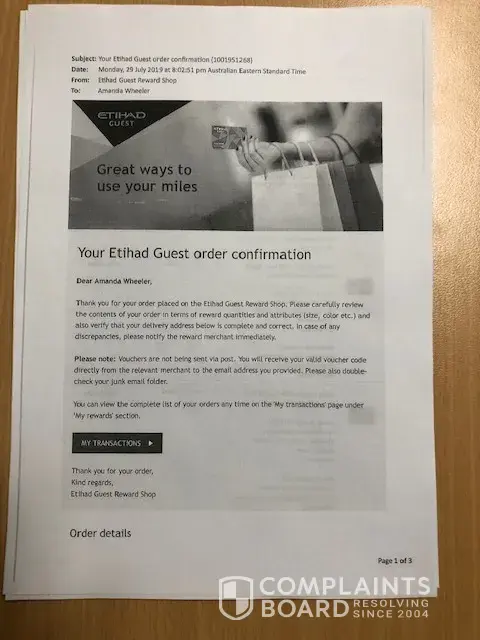 On July 29, 2019 both myself and partner redeemed our Etihad air-miles for David Jones department store vouchers (see attached pdf receipt-of-purchase confirmations. The air-miles total was 23, 200 for each of us; worth AU$210 each.