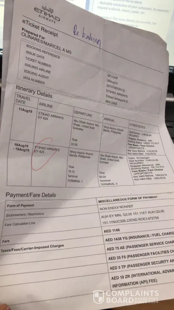 Upon our return to Jeddah on August 16, 2019 the ground staff at the check in counter of Etihad Airways in NAIA terminal 1 told us that we no longer have a booking as the ticket(E-ticket number: [protected]) via EY 423 have had been cancelled already.