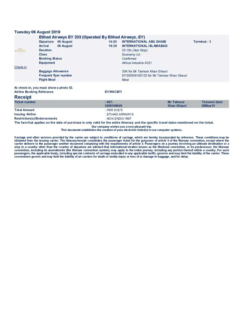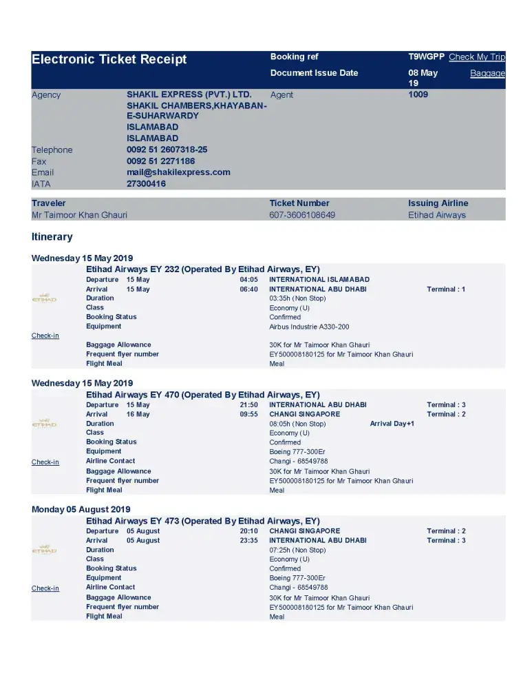 I, Taimoor Khan Ghauri booked Etihad Airways on 8th May 2019, having booking reference number T9WGPP. I availed the ticket from Pakistan to singapore on 15th May 2019. For return flight, I informed my travel agent and also to Etihad Airways, well in time before departure of flight, that I was unable to fly back to Pakistan, due to my course extension in Singapore.