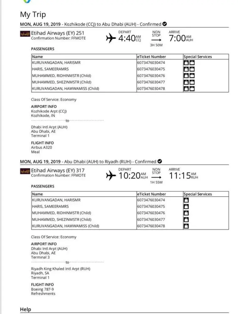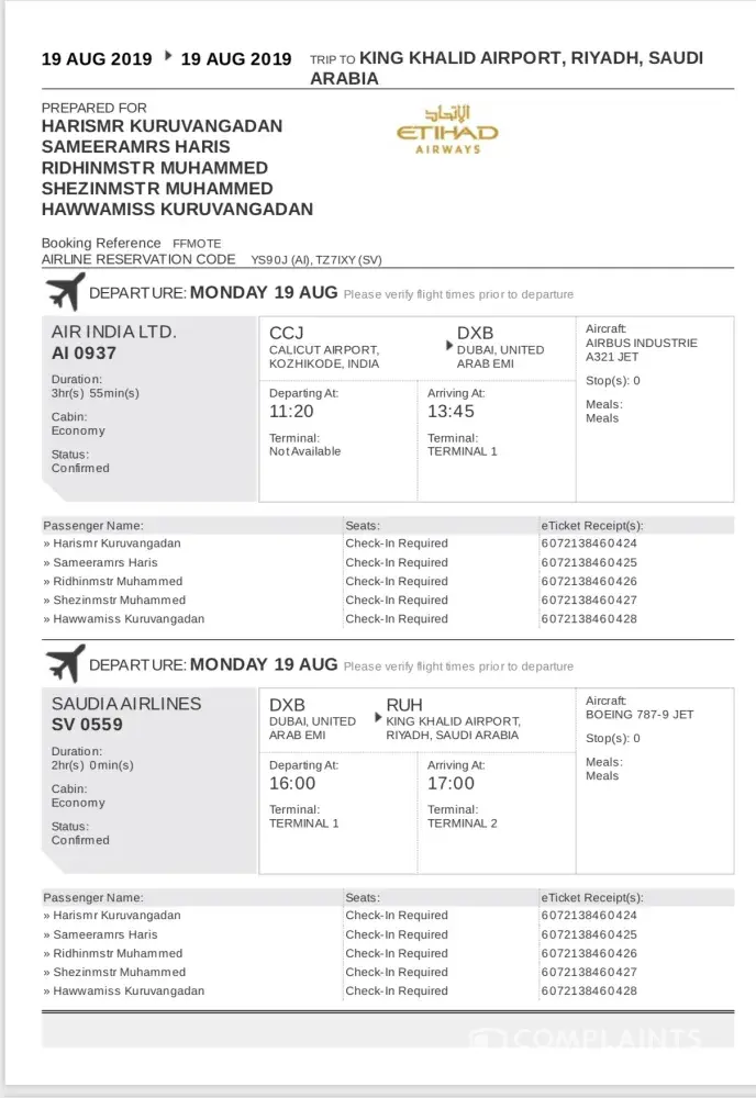After reaching the airport on the morning of 19/Aug we have understood that our travel is arranged in Air India Airlines (Flight number : AI 0937 at 11.20 Hrs ) and have a connection flight to Riyad from Dubai in Saudi Airlines (SV 0559 at 16.00 Hrs). We were also shocked to know that the EY 251 was taken off at the right time on 19th Aug itself and only our seats were shifted to other airlines as the flight was over booked. This was highly disappointing as the Ethihad airlines has decided to move the tickets of a family who had booked the tickets well in advance ( 4 months before) and also has 3 children out of which 1 is an infant.