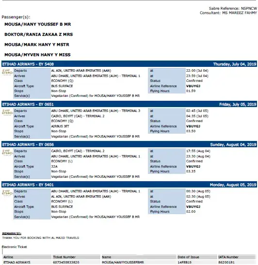 I made a reservation on [protected] on August 7th, and used my husband credit card for the payment. The booking was made for my cousin's sons (Saeed & Butti). The lady making the booking was very careless. First of all, she didn't confirm the email and was in a hurry to complete the booking. Secondly she DID NOT inform me that the passengers will require the credit card picture/number for checking in at the airport.
