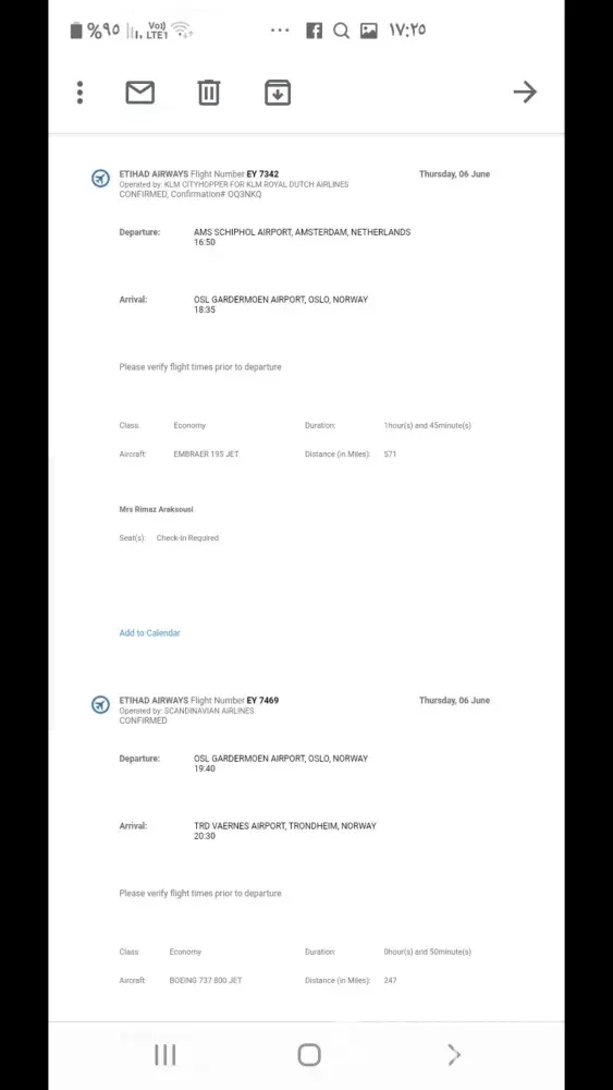 My name is Rimaz Araksousi. My flight from Amsterdam to Oslo ( EY 7342) on 6 June 2019 landed very late in Oslo which caused me to miss my connecting flight from Oslo to Trondheim ( EY 7469) . I stayed in Oslo til next day in order to catch the morning flight ( SK 338) on 7 June 2019 so the delay was for one day and i would like to get compensated for that. I contacted SAS airways nut they referred me to Etihad since Etihad was the operating carrier.