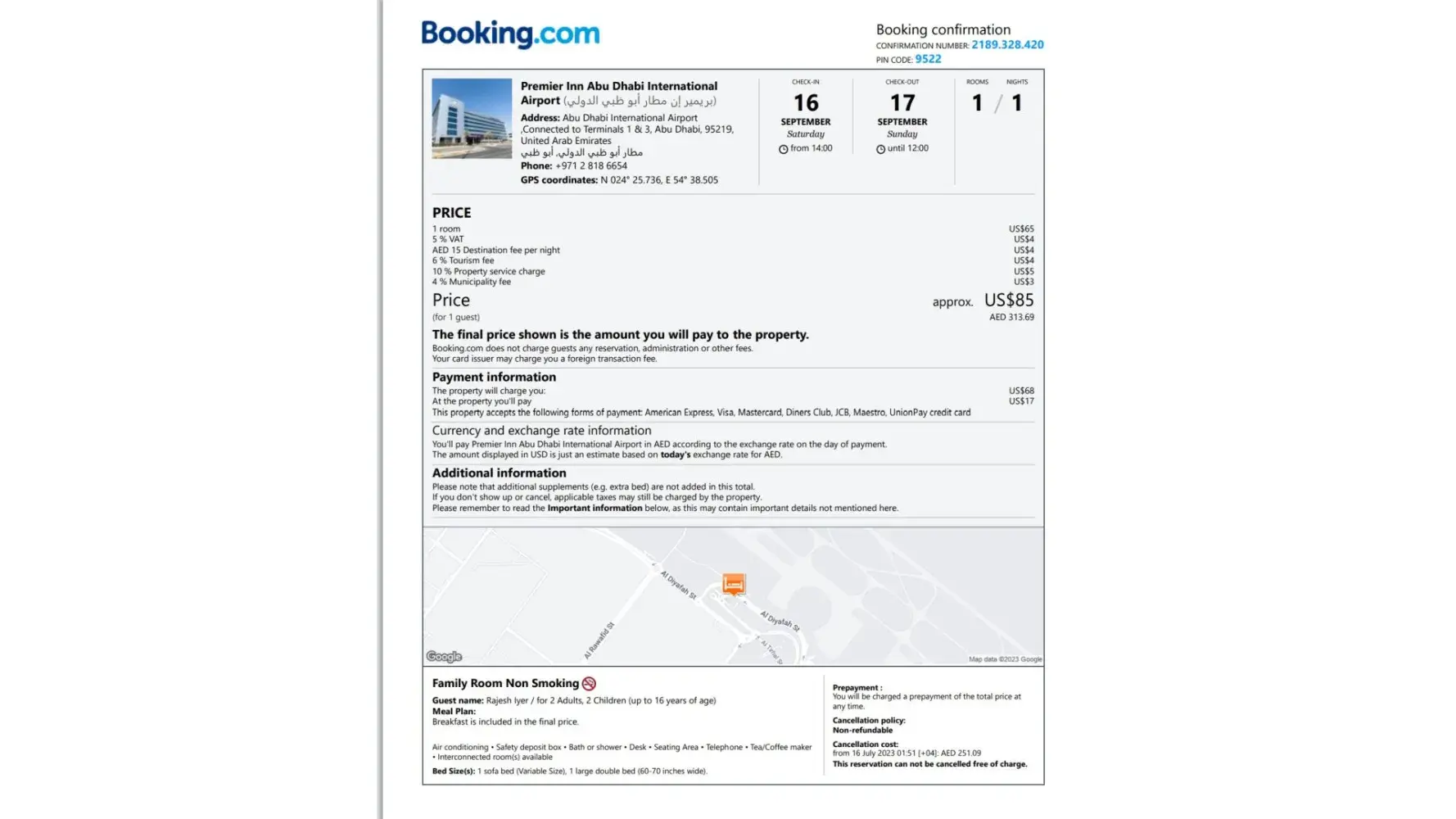 Desired outcome: $85 refund which i paid for Transit Hotel stop over at Premier Inn Abu dhabi Airport for Sept 16th night. See attached receipt I paid out of my pocket. I didnt want to risk losing full availability at the hotel attached to airport.