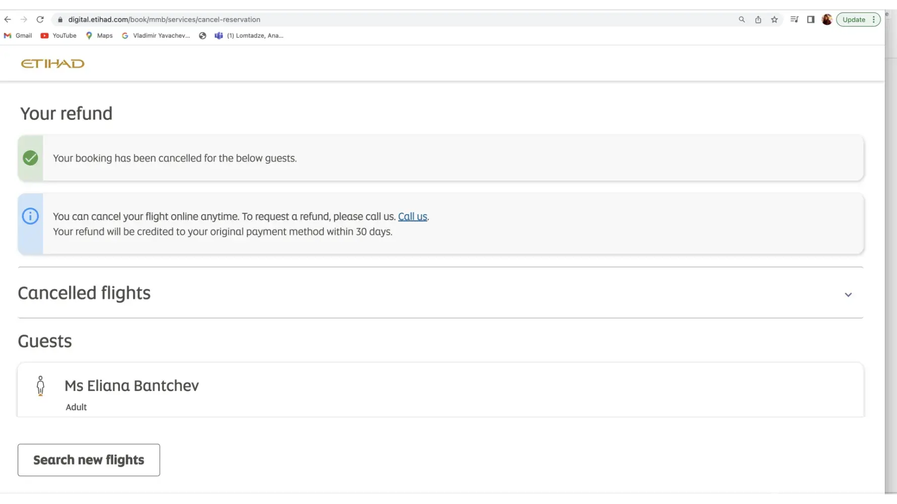 The flight was successfully cancelled online and I expected to receive the amount without any trouble, as I fully trust Etihad and recommend it.