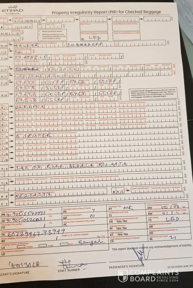 I Subhadeep Halder, buyed both ways Tickets from Etihad Airlines for my Russia Trip.e-Tickets number:6072946273948C4.on 25th of 2018 i travelled from St.pettersburg to Delhi.we complete my check in with my two luggage but After reaching Delhi we founds only one luggage.when I going to complain about it's first etihad employ said that he will not Avail to take complaints.then after doo many coneversation he ask for my original tag for lost luggage and said me that he taking complain but will not provide any receipt copy. I didnt find any alternate way so I agreed that and take my complaints photo copy and original tag photo also.thay taken original luggage tag from me and inform me that within 3days they will delivery my luggage in my door step.but till day they didn't inform me about my luggage. Please give me a solution about it.