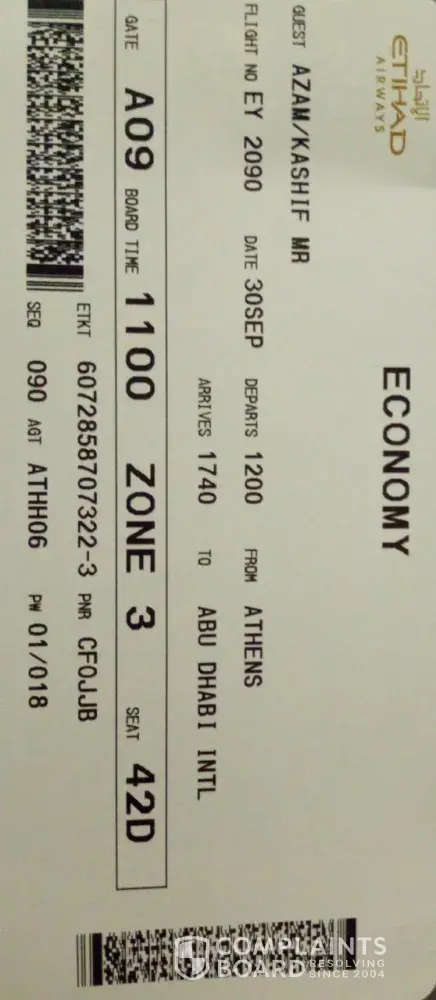 I, Mr. Kashif Azam along with Mr. Muhammad Zakir and Mrs. Muqaddas Zakir were scheduled to travel through your flight EY 090 from Athens to Abu Dhabi on Saturday, 29 September 2018. However, due to bad weather the flight was cancelled and passengers were provided with accommodation and food at hotel by M/s Goldair Handling. We were told that our rescheduled flight will be departing at 1200 hrs next day so we are required at the airport by 0800.