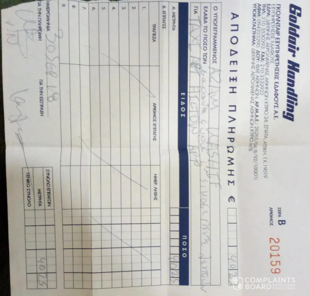 I am enclosing pictures of my next flight boarding card, the limousine bill and the receipt of 40.25 euro bill refunded by M/s Goldair Handling.