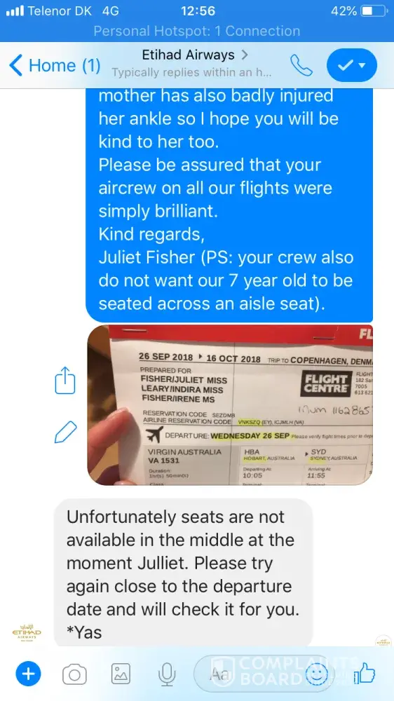 I have contacted Etihad through Facebook, our travel agent and via phone. They say they cannot seat is together. I have sought legal advice which says that Indira should be swayed with me because otherwise Etihad will be liable should anything happen to her because we are seperated. I do not know why this is so difficult and why the staff continue to be so cold in their responses.
