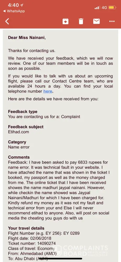 I have been asked to pay 6833 rupees for name error. It was technical fault in your website. I have attached the name that was shown in the ticket I booked, my passport as well as the money charged from me. The online ticket that I have been received showes the name madhuri jaypal nainani. However, while checkin the name showed was Jaypal Nainani/Madhuri for which I have been charged for. Kindly refund my money as it was not my fault and technical error from your end