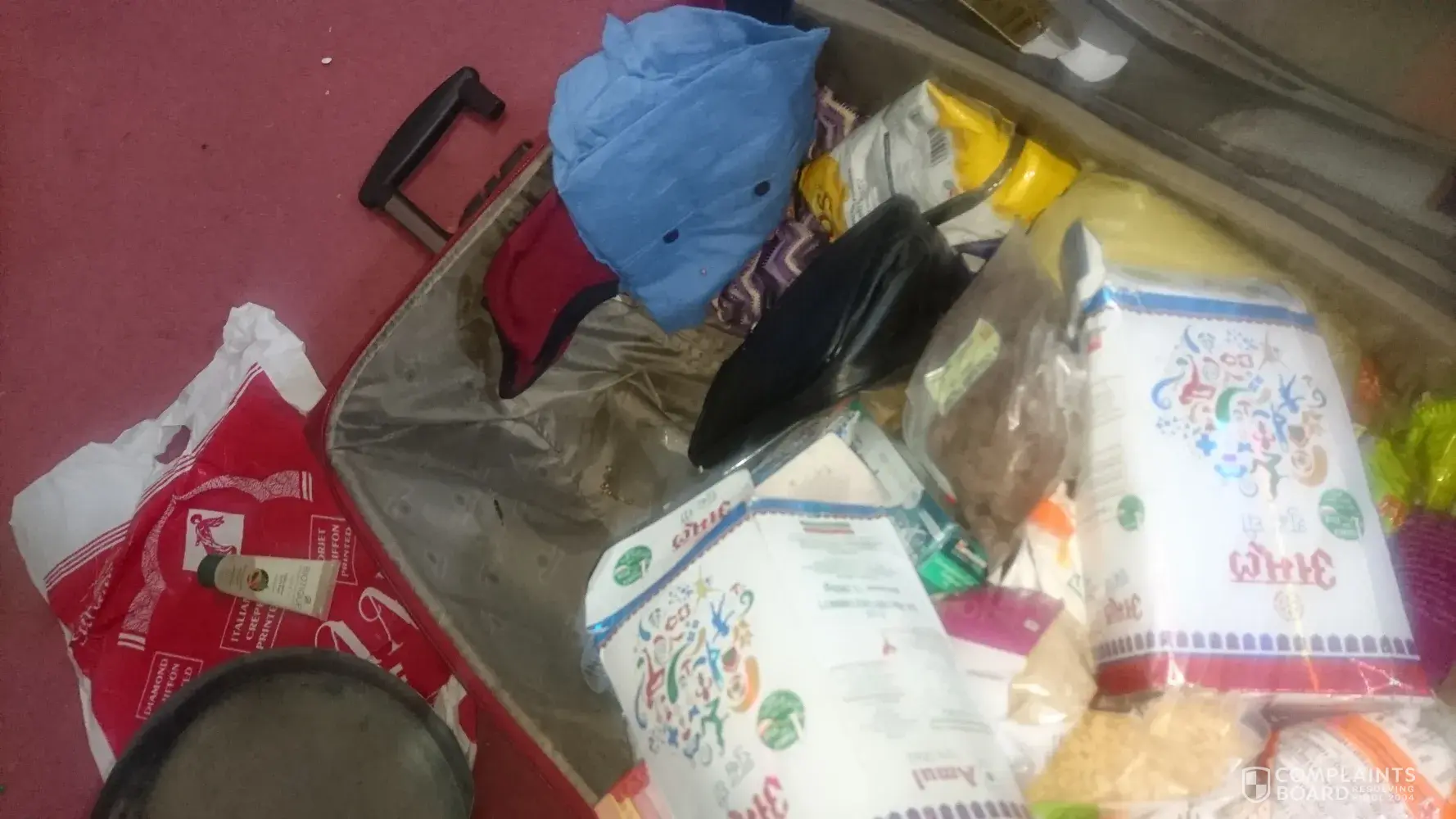 Secondly, on 12/04 when I received the bag it was completely damaged. Handle wheel material everything broken in the suitcase. All luggage inside was in pieces, liquid bottles broken, all my clothes are soaked in oil and all food packets were broken and mixed with each other. The bag was completely ripped. All gifts everything I bought was in pieces.