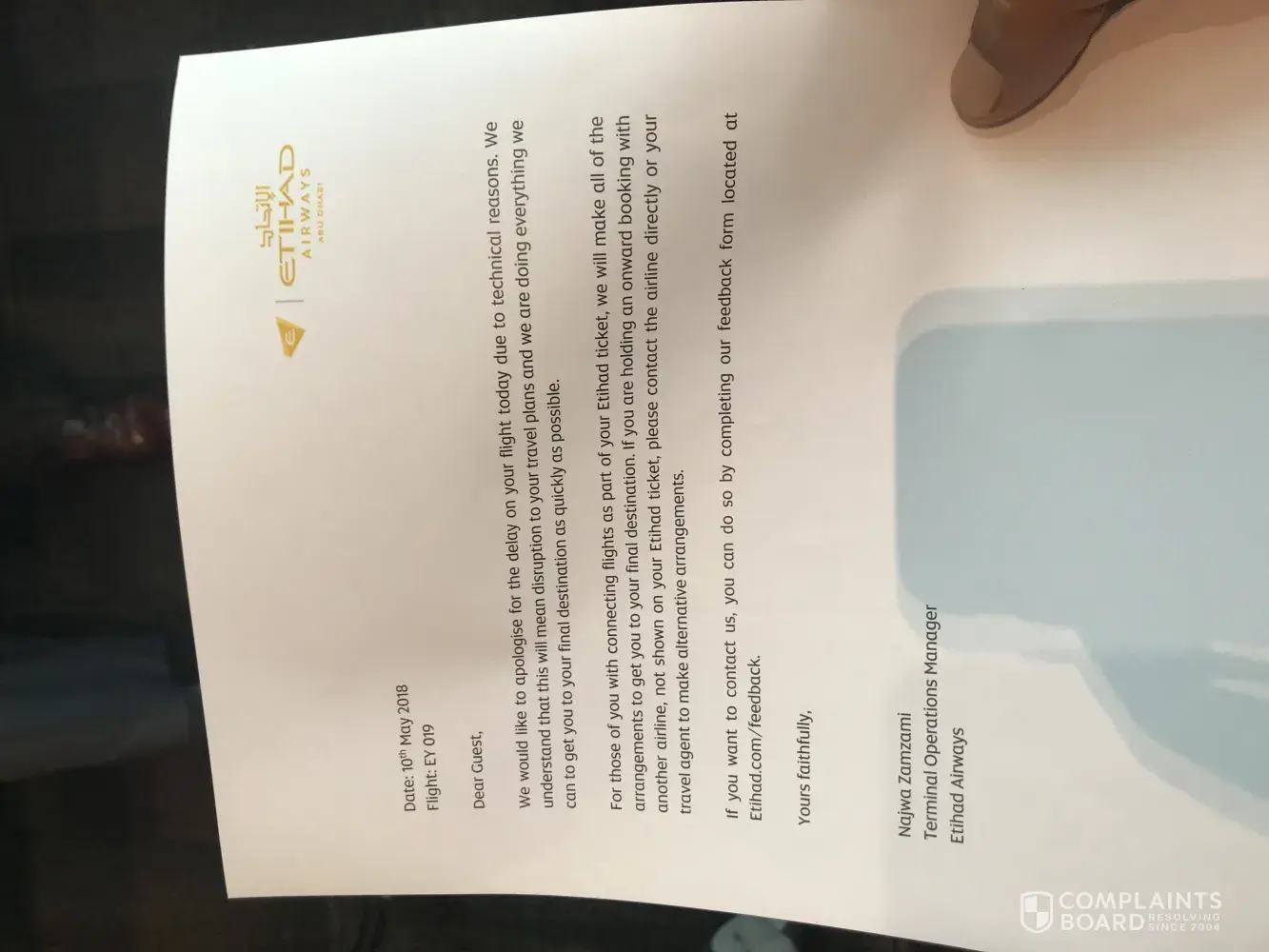 delayed flight ey017 on 28th april