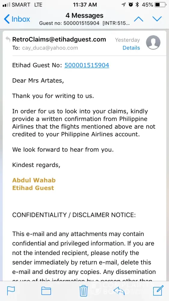 Thank you for the reply. In addition to reporting the complaint on this site, I also sent a complaint to the etihad guest email address.