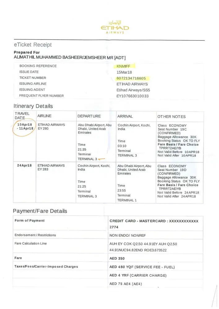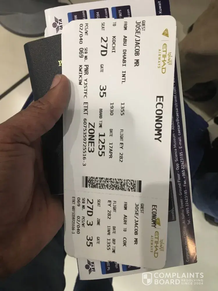 We both received the boarding pass 18/4/18 at 7.45am to fly way Abudabi to Cochi then after 9.30am they announced that the flight is cancelled and another flight will b 4.20pm that also kwt-Abu-Chennault-Cochin. And it will be reach at Cochin by tomorrow 11am. How horrible it is we are traveling for very urgent some banking documentation how can we tolerate this kind irresponsible so cruel it is our 2days is going to waste we want the competitive from the Airlines