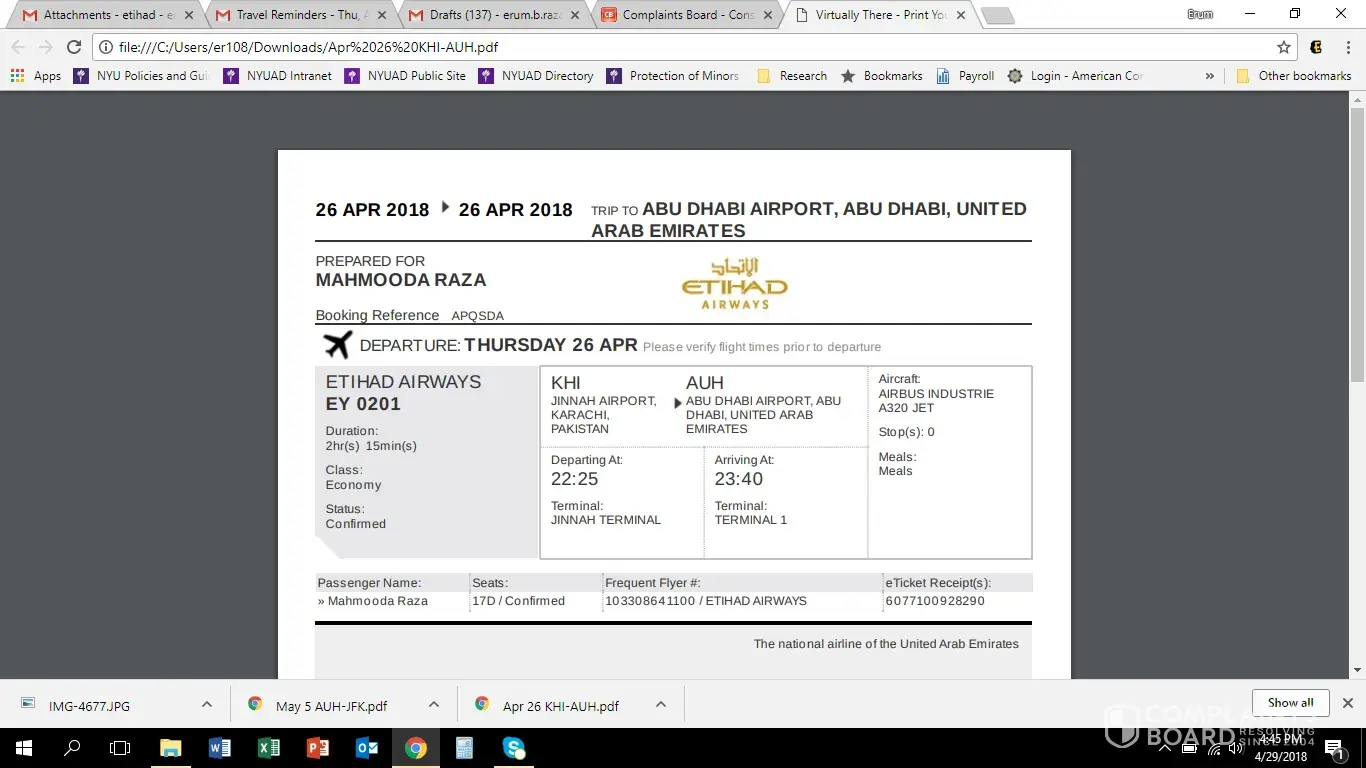 After this, my mother stepped away from the counter to rearrange luggage between different pieces in order to reduce the weight of the second bag she was told she now had no choice but to pay 4, 646 Pakistani Rupees. While she was rearranging her luggage Etihad staff stood around her and watched. The Karachi airport porter who was assisting my mother remained with her and provided more assistance and was more respectful than any Etihad staff. He also observed and told my mother that while she was rearranging luggage the Etihad staff were watching her and he had seen enough to know these individuals would not leave her alone.
