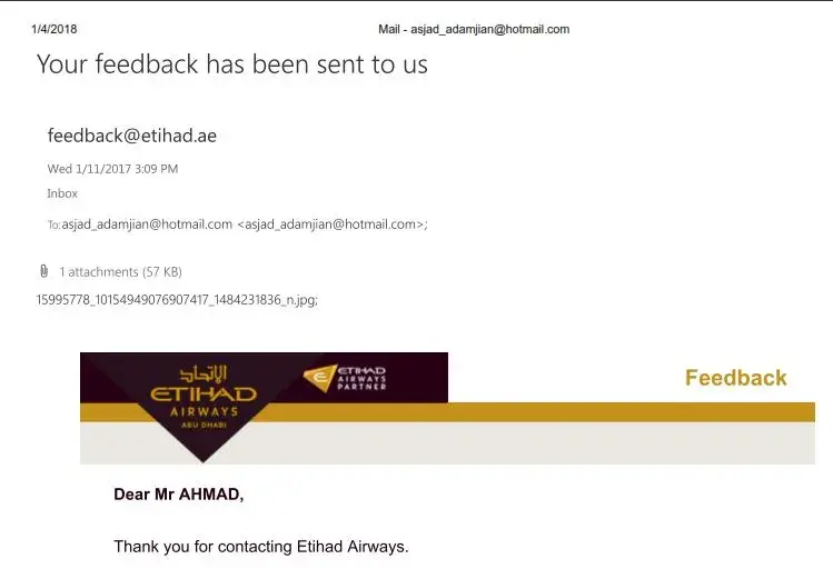 I have trusted that Etihad Management would see clearly the merit of my case and would resolve it. I was very wrong. It's not about money. I'm looking into other legal recourse and going to appropriate authority.